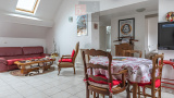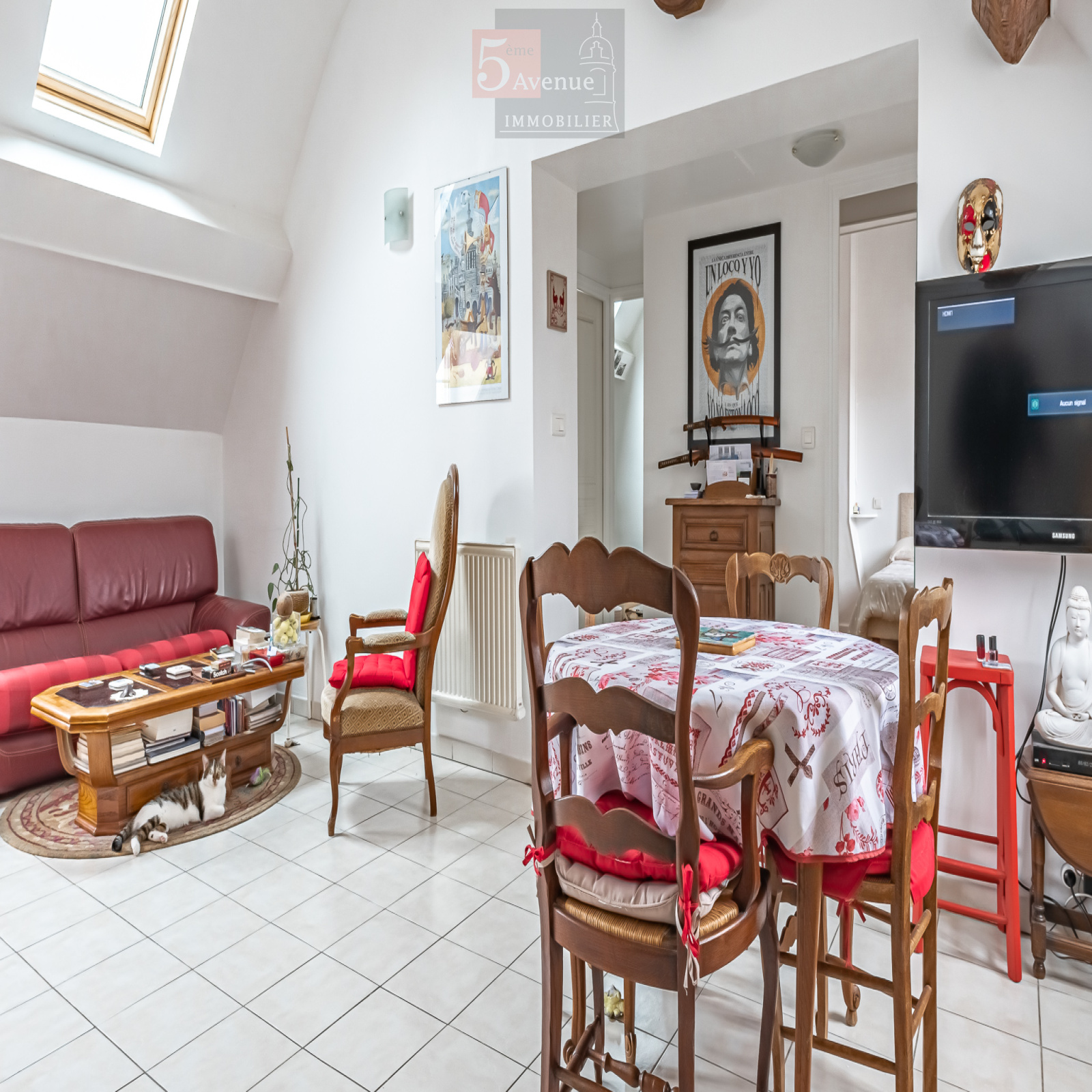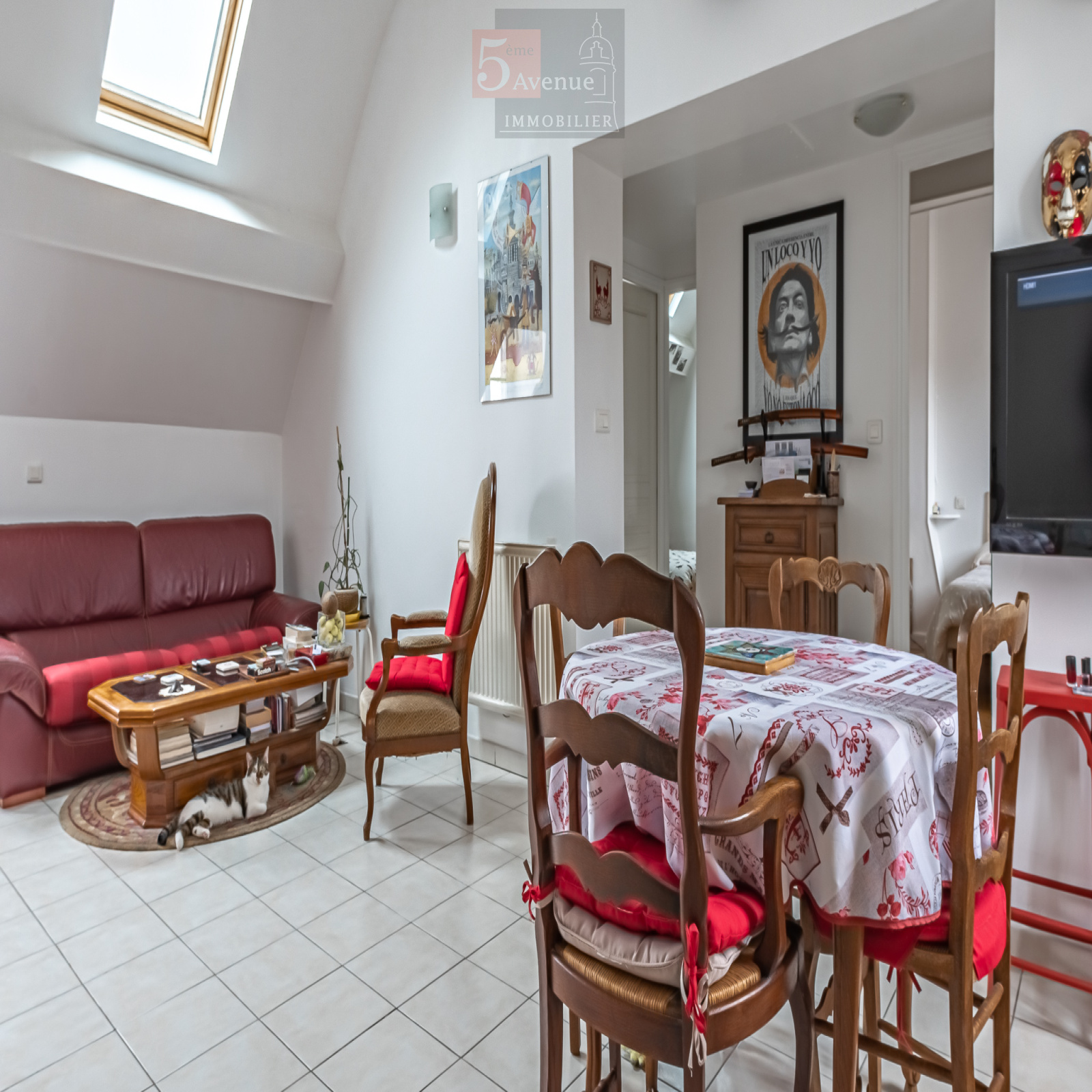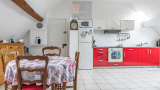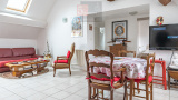 On y retrouve un vaste salon salle à manger avec sa cuisine équipée, la pièce est innondée de lumière de part ses ouvertures traversantes et sa fenêtre de toit