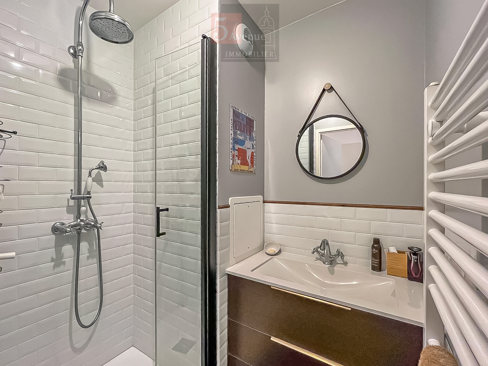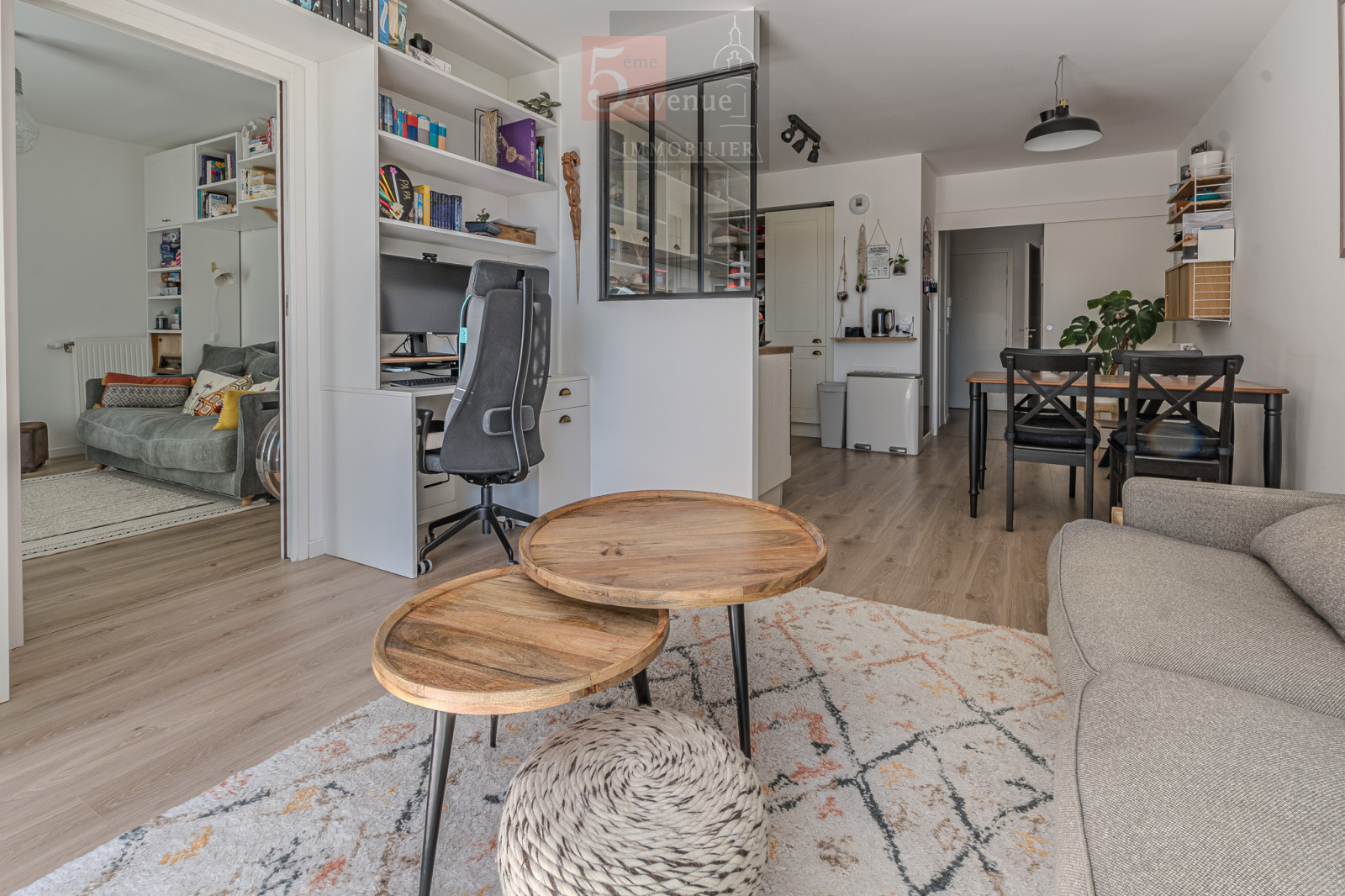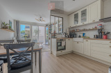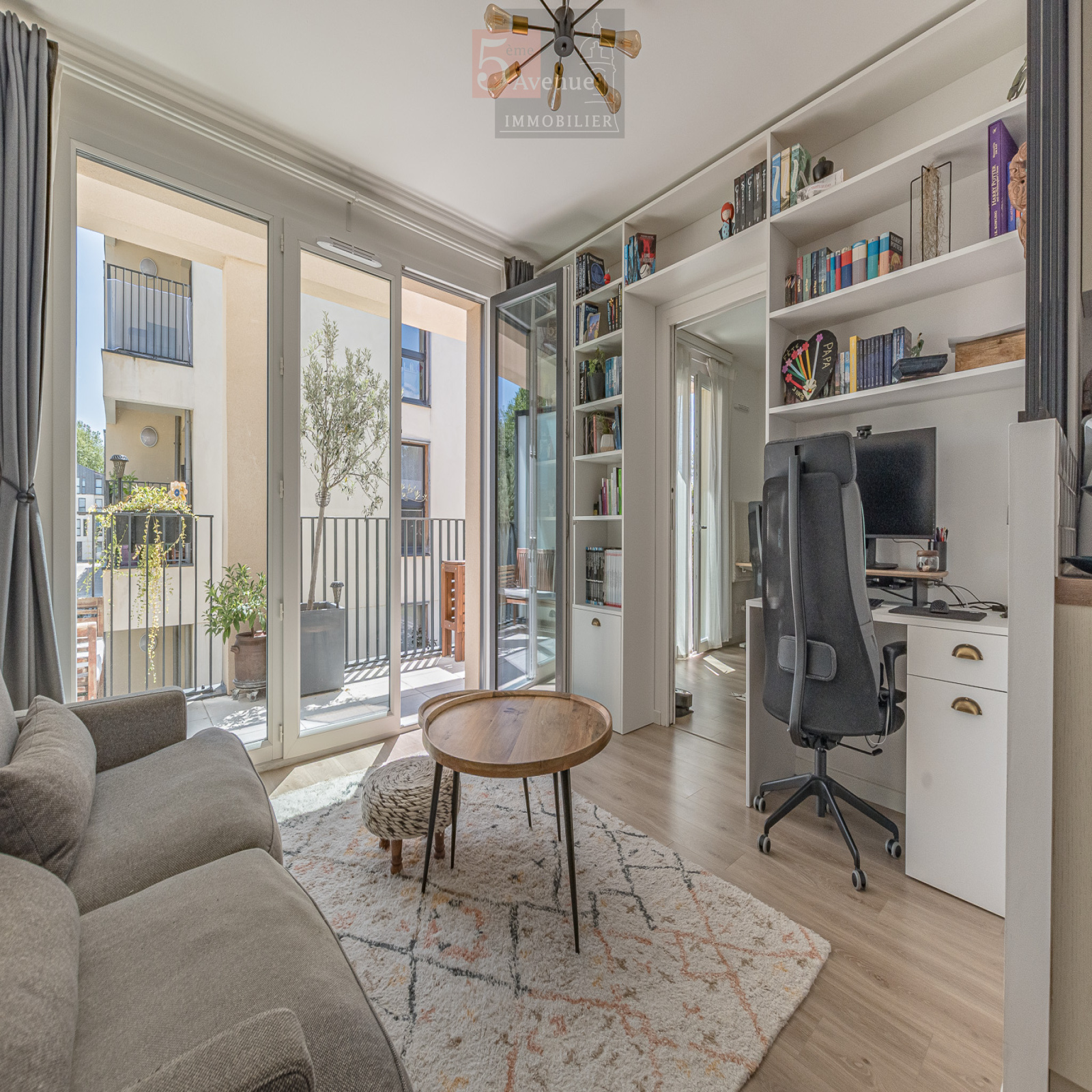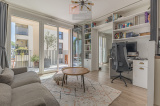 L’entrée avec rangement, séjour très lumineux, s’ouvre sur une première terrasse de 12 m² et comprend une élégante bibliothèque sur mesure. La cuisine ouverte, signée Arthur Bonnet, allie fonctionnalité et esthétisme.