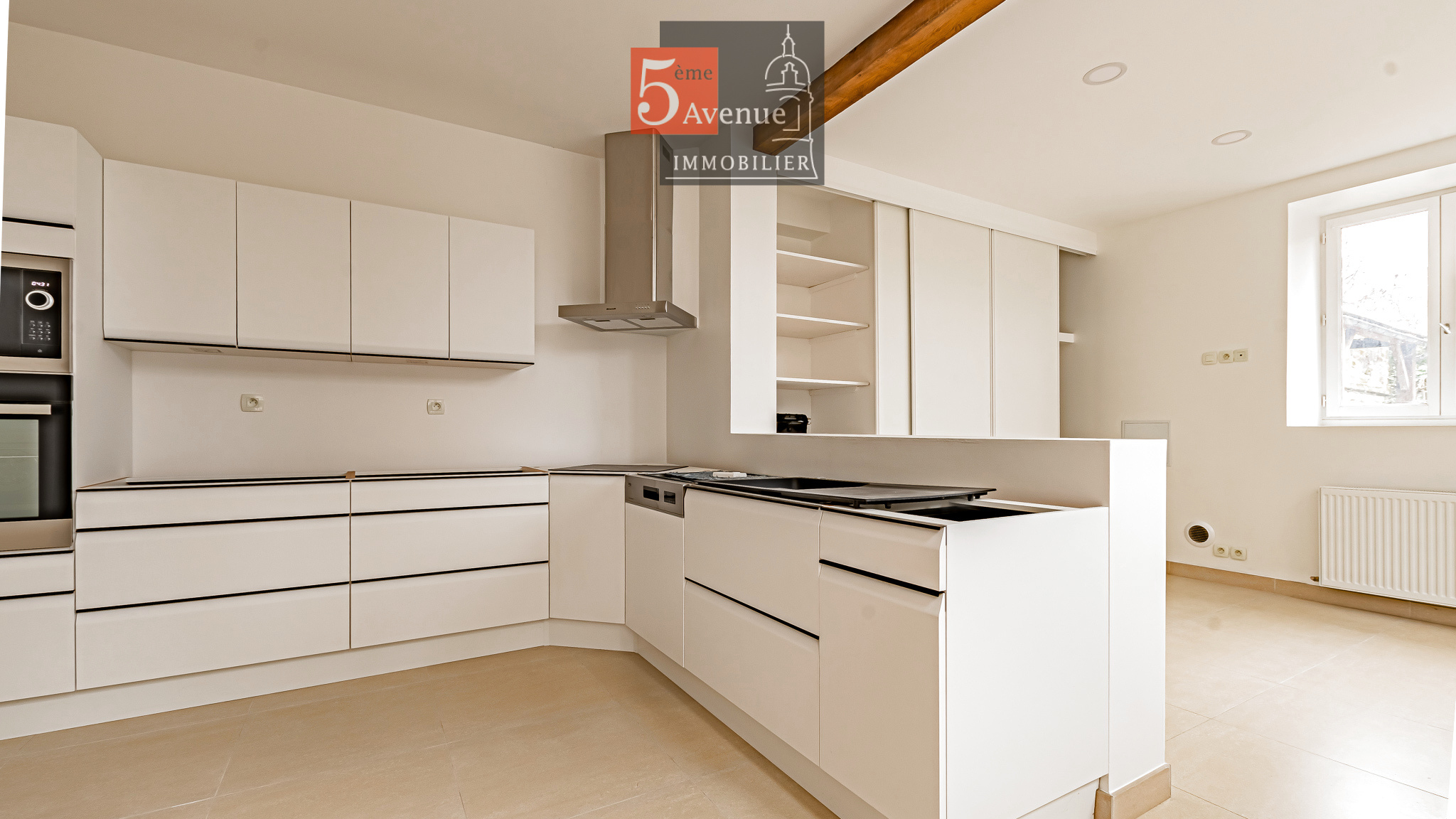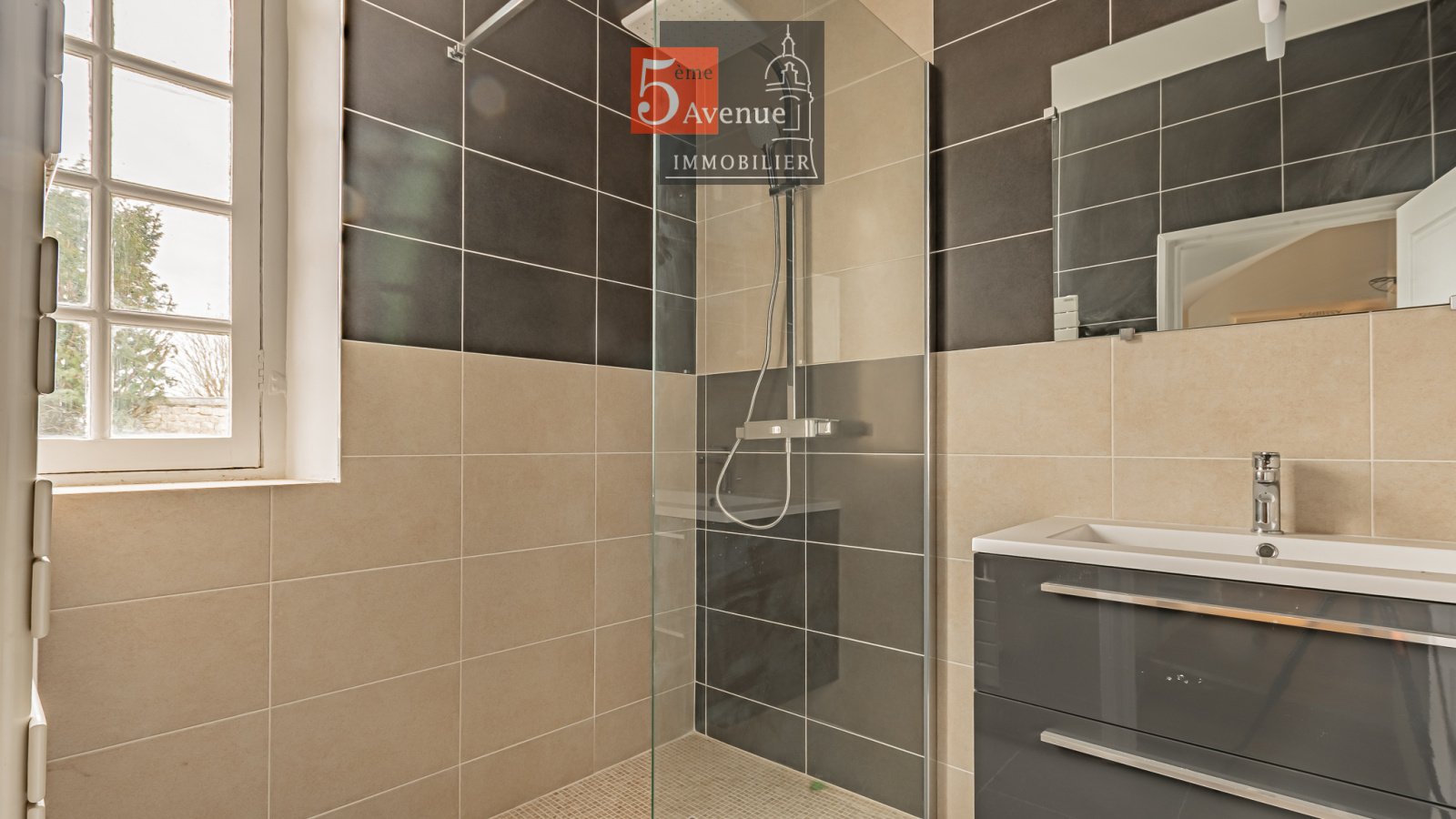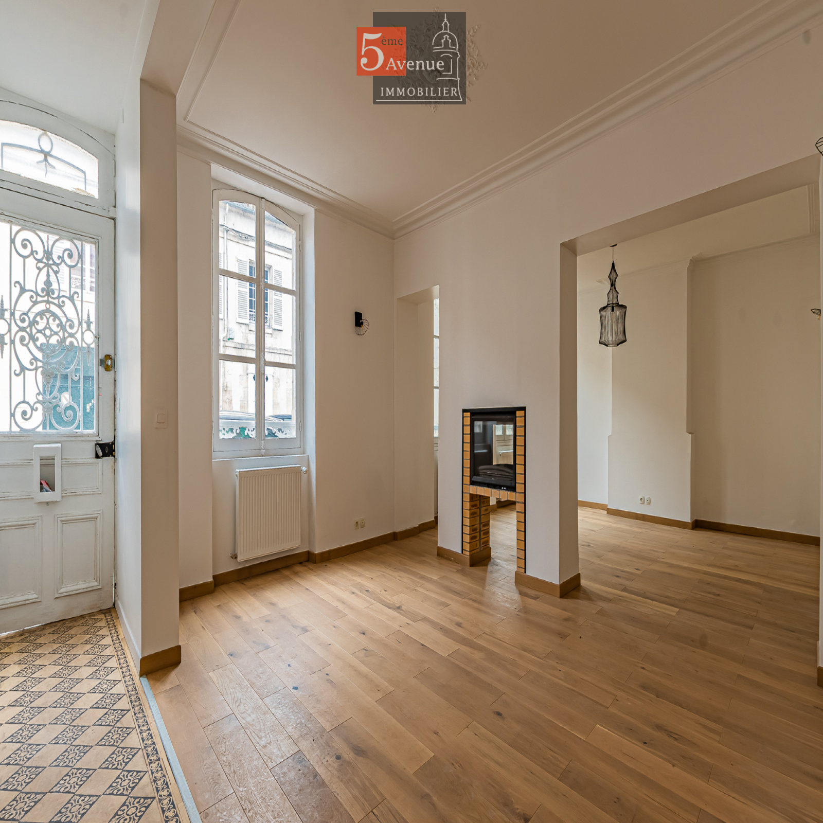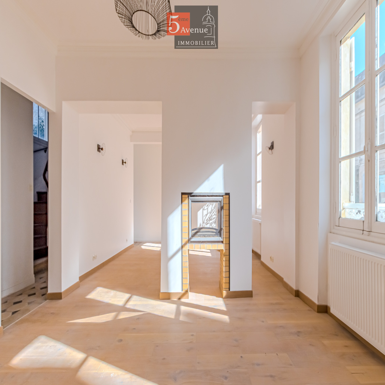 Le rez-de-chaussée se compose d’un double séjour lumineux avec cheminée centrale. La cuisine indépendante, entièrement équipée, offre un accès direct au jardin.
