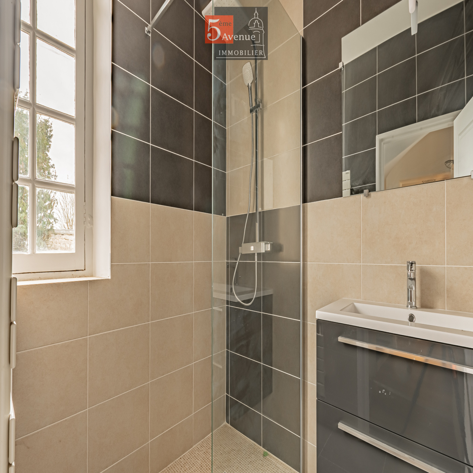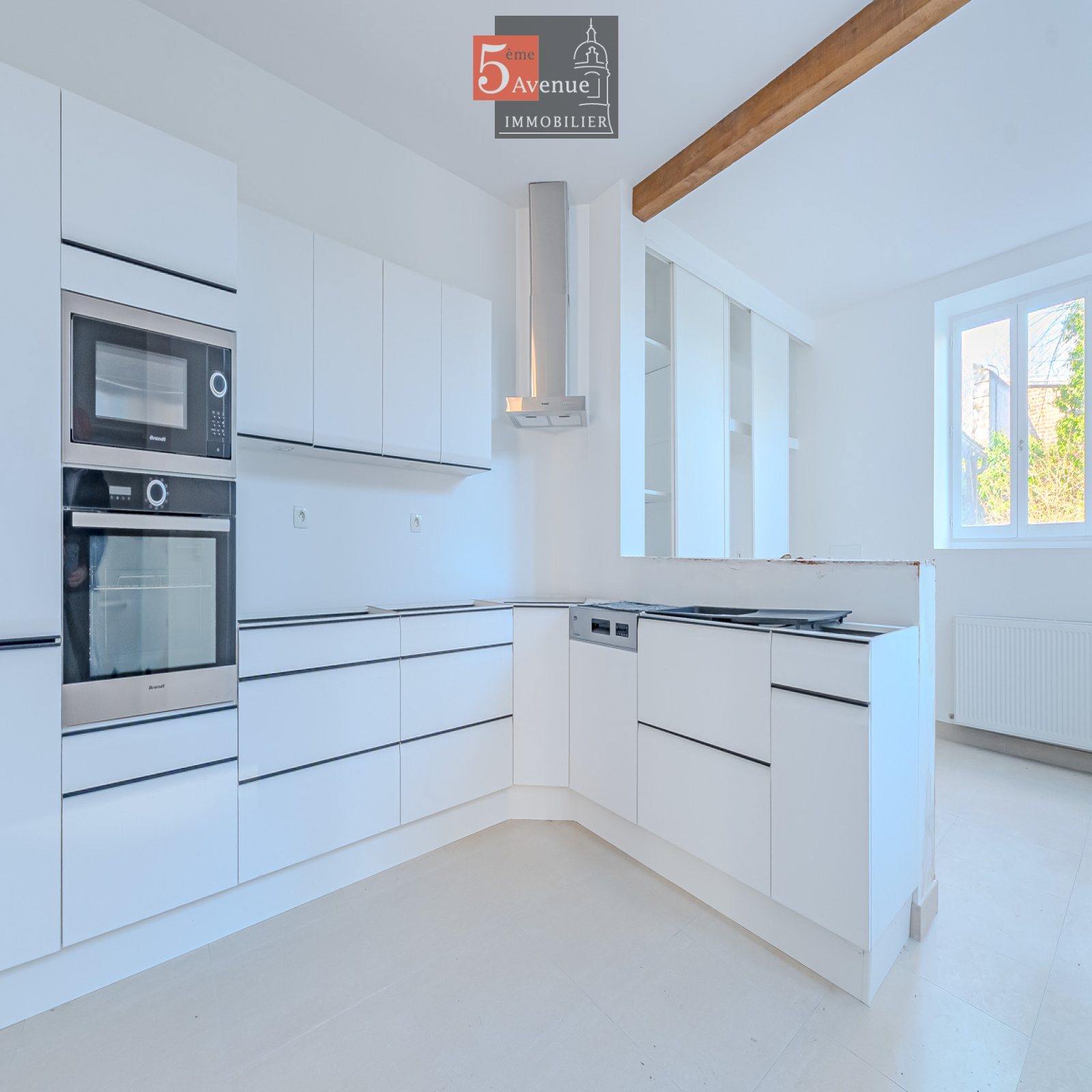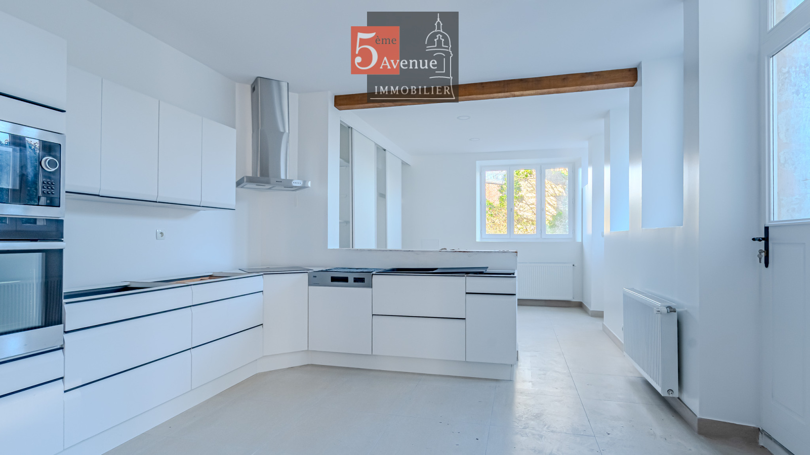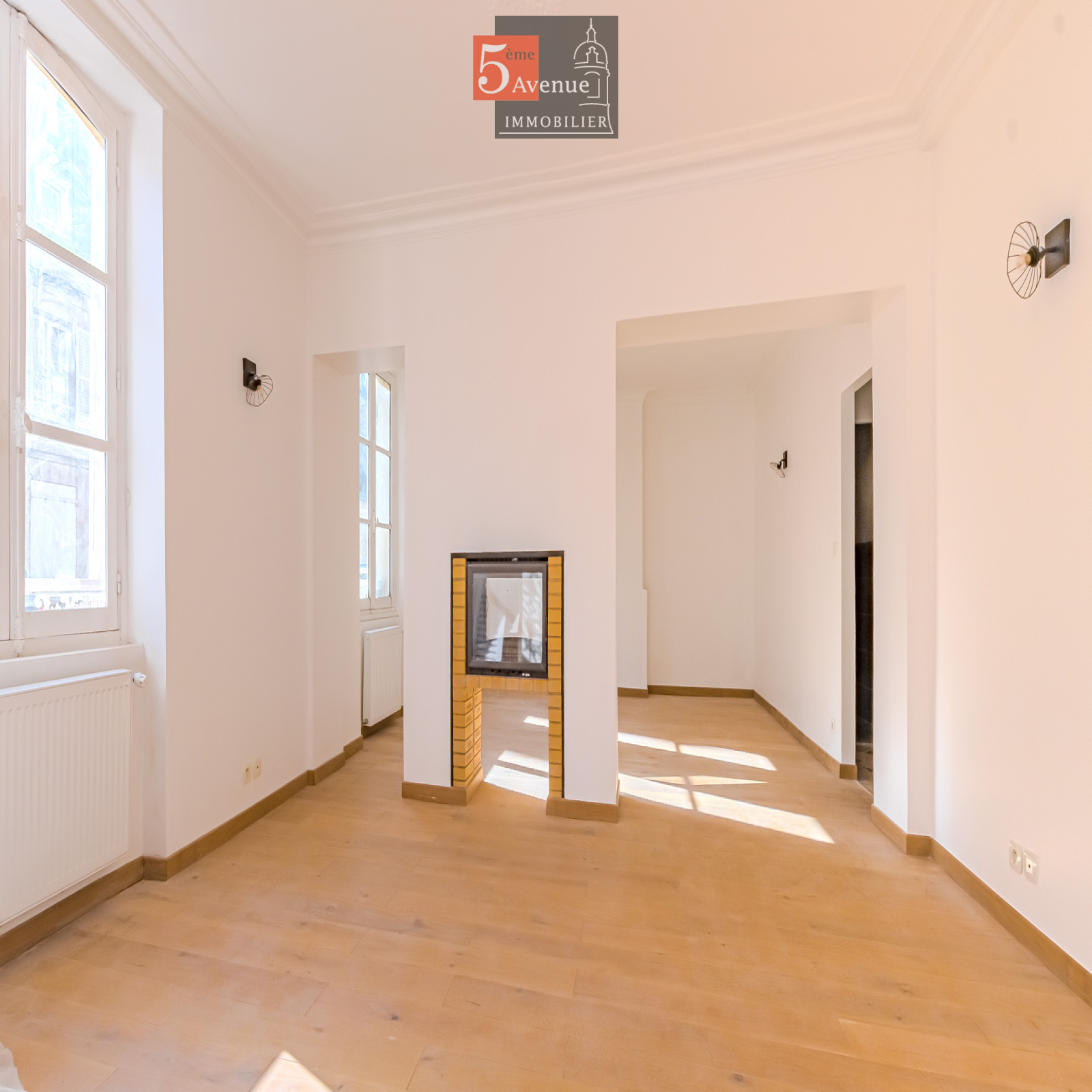 Le rez-de-chaussée se compose d’un double séjour lumineux avec cheminée centrale. La cuisine indépendante, entièrement équipée, offre un accès direct au jardin.