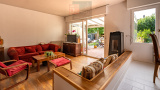 Entrée donnant sur un séjour avec salle à manger et salon équipé d'un poêle à granulé, cuisiné séparée et une chambre.