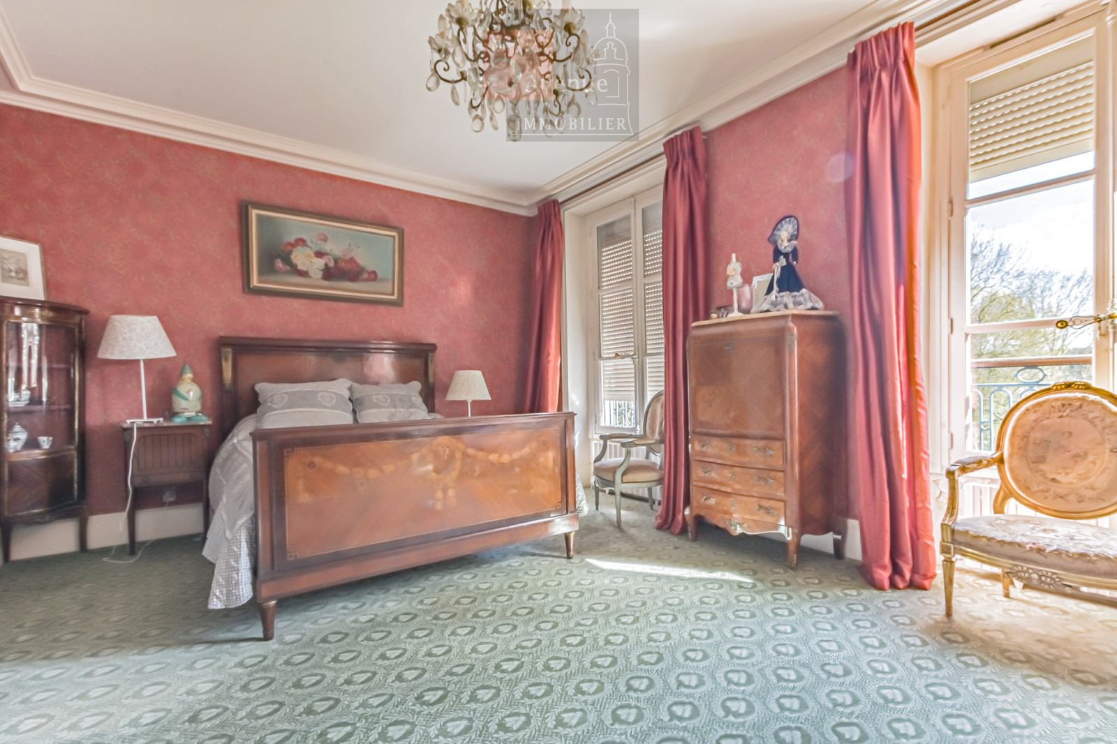 Au premier niveau, vestibule d'entrée donnant sur un vaste salon de 60m² ouvert sur la terrasse et la parc (plein sud), bar, salle à manger, cuisine, et bureau, parquet Versailles, double exposition, cheminées anciennes.