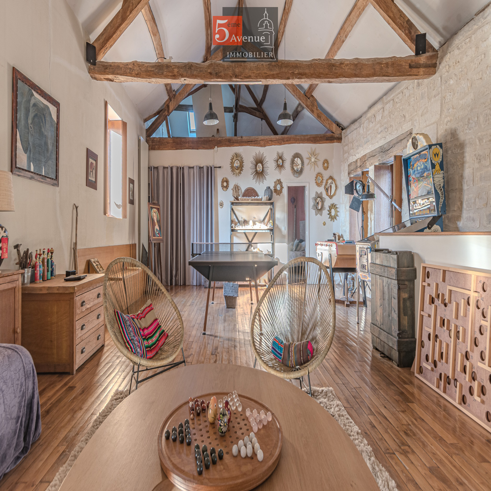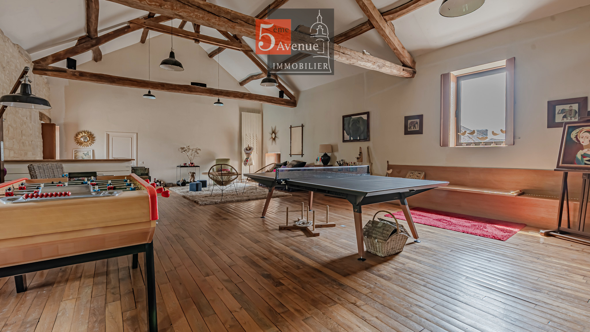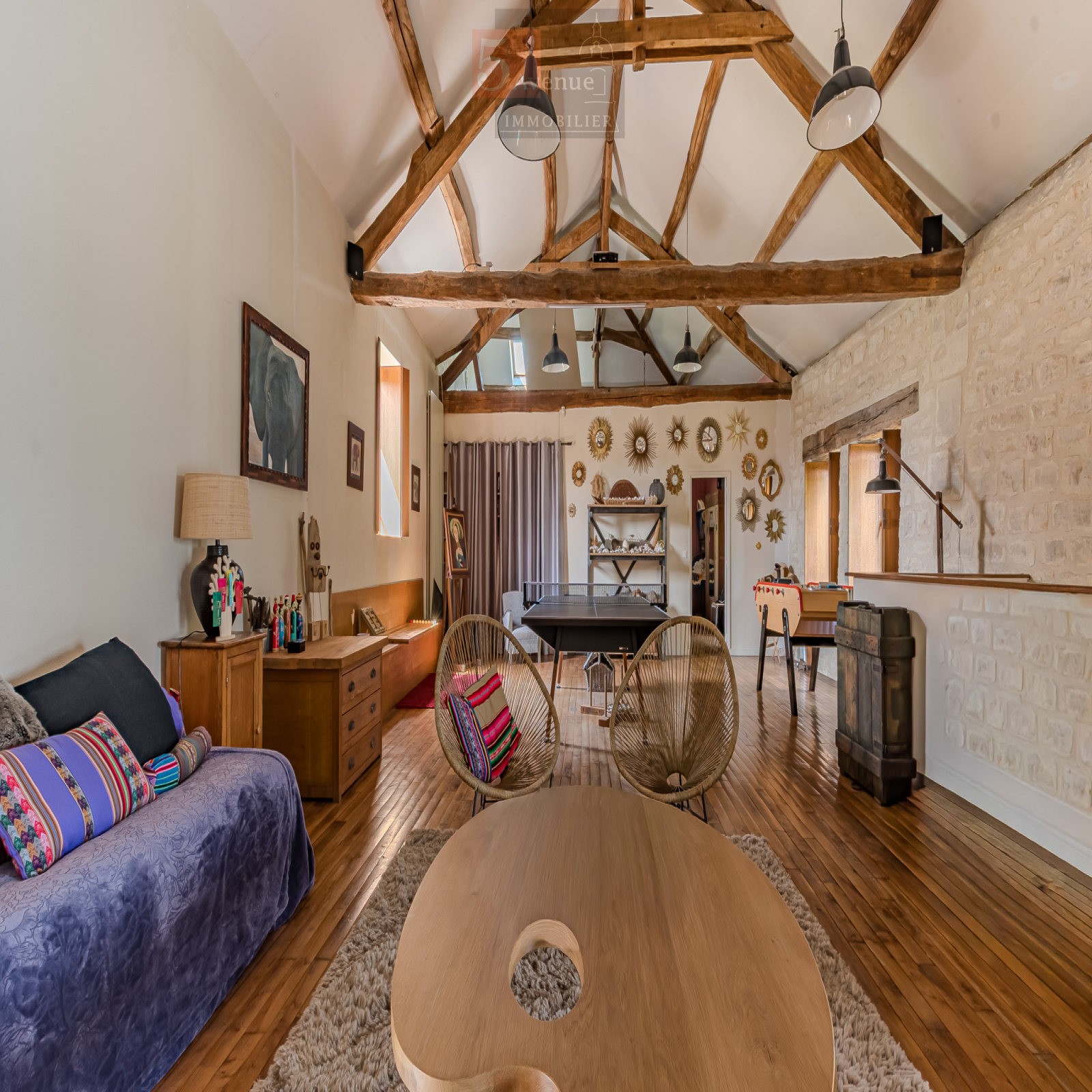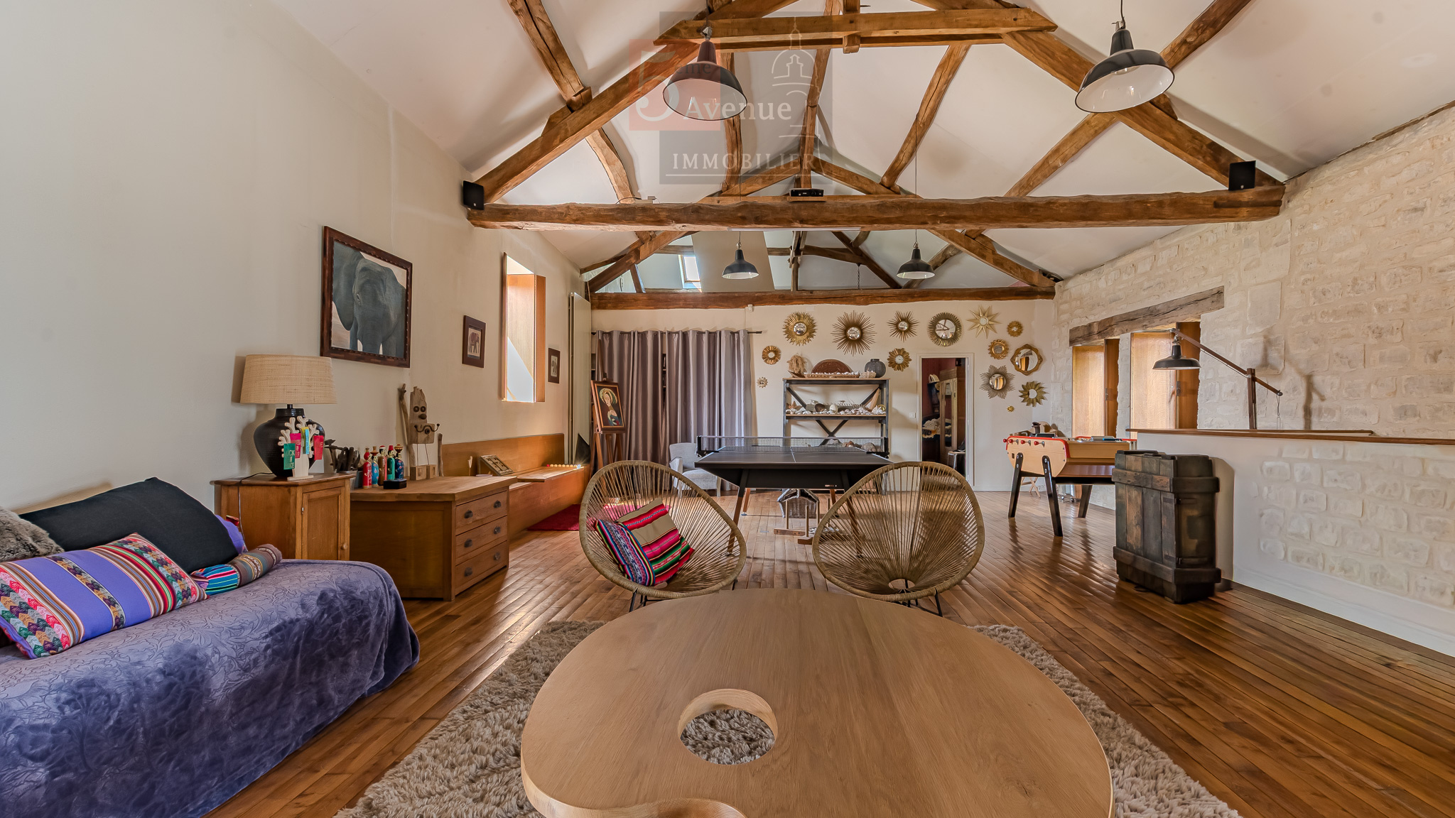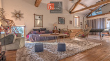 À l’étage, l’espace de vie surprend par ses volumes : un spectaculaire salon cathédrale de 75 m² aux poutres apparentes crée une atmosphère chaleureuse et lumineuse