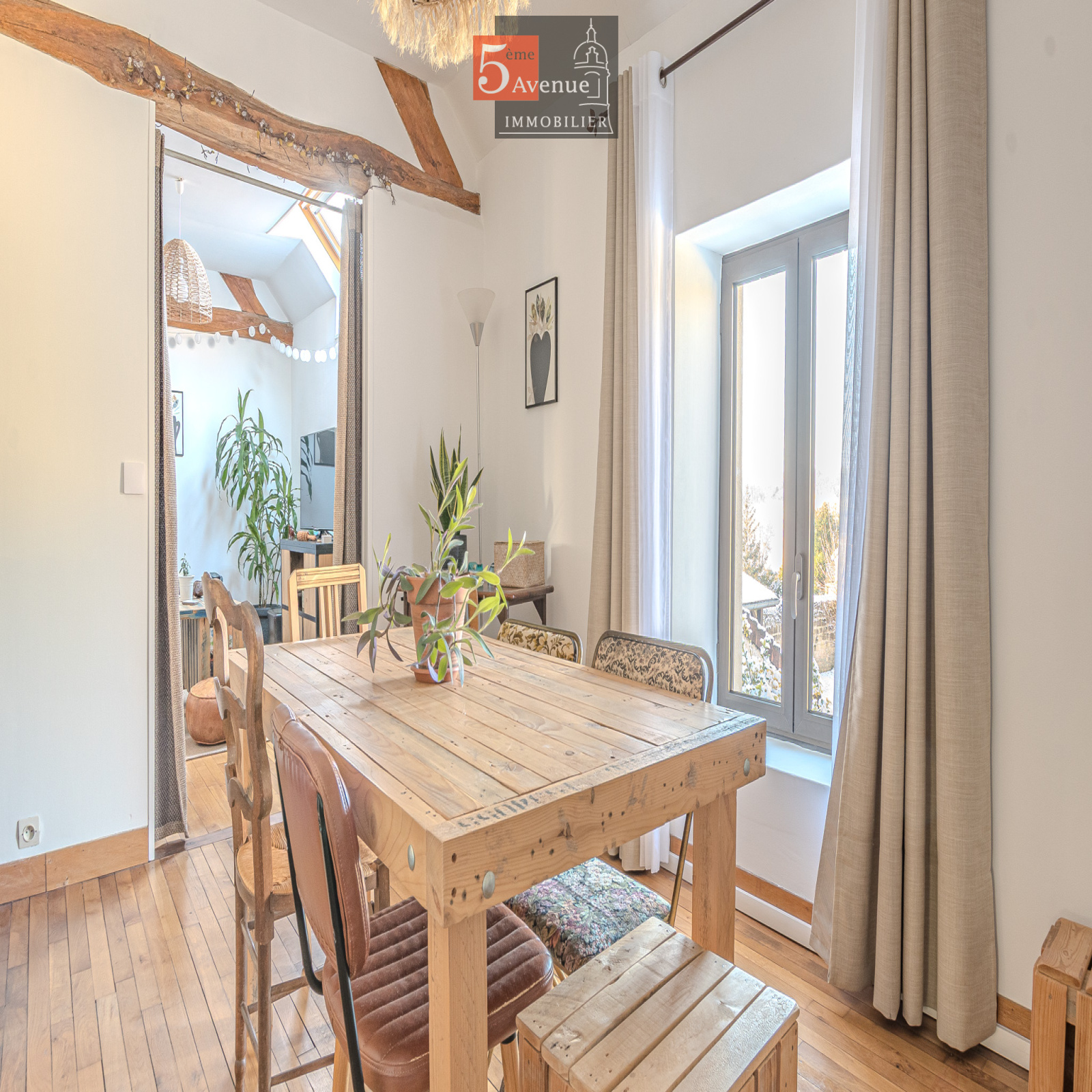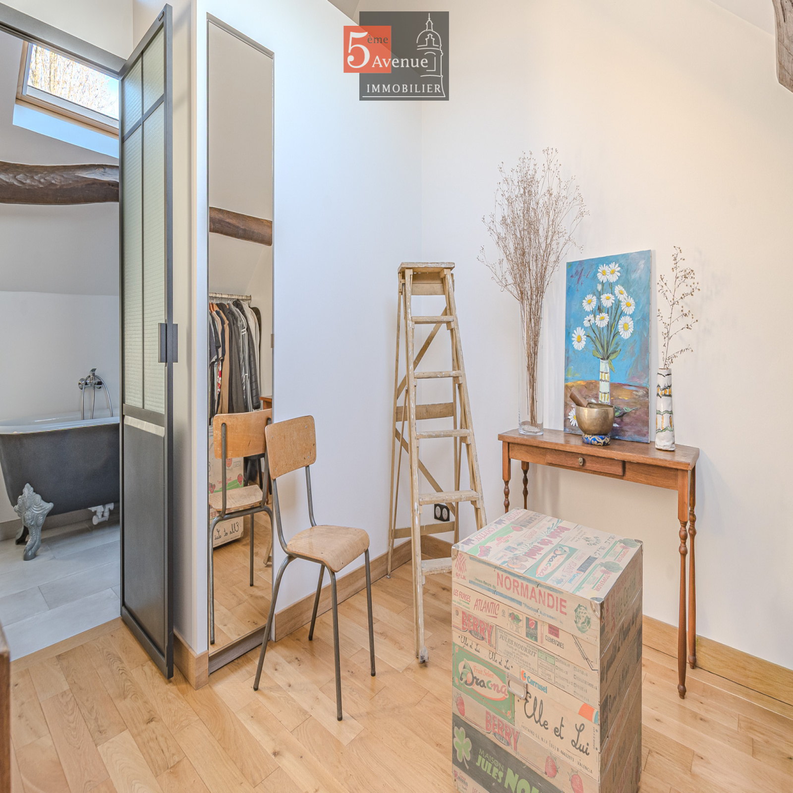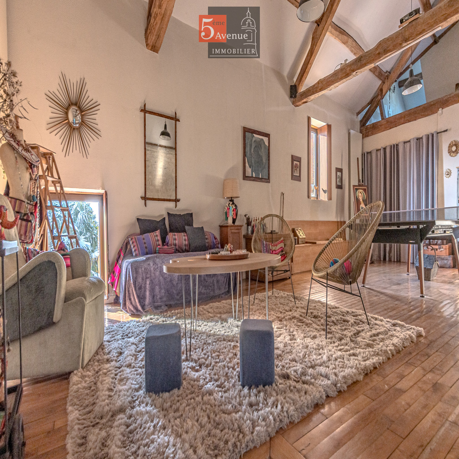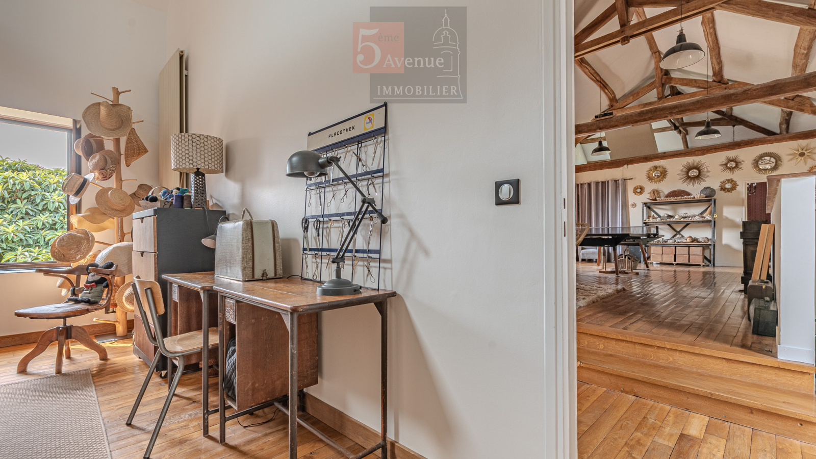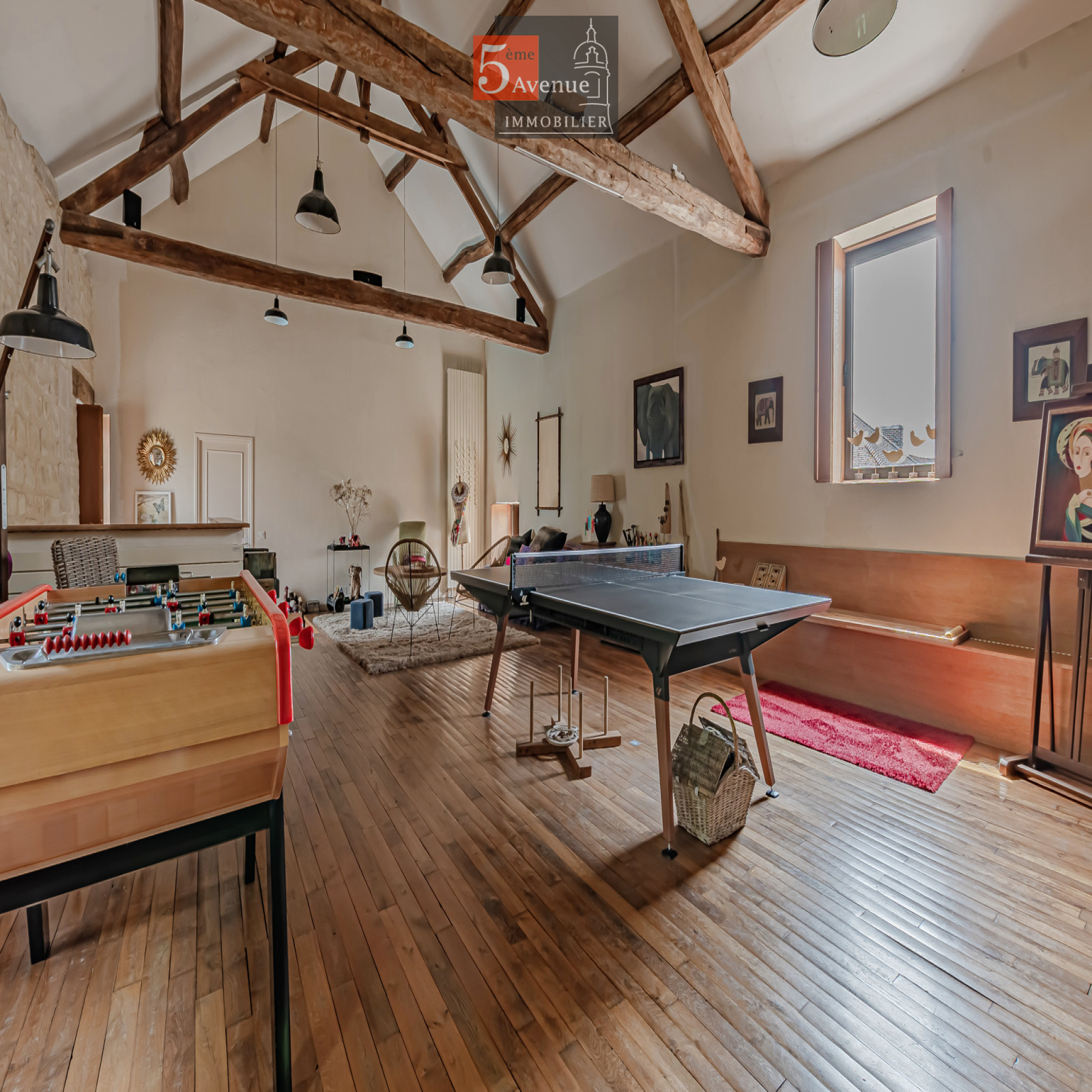 À l’étage, l’espace de vie surprend par ses volumes : un spectaculaire salon cathédrale de 75 m² aux poutres apparentes crée une atmosphère chaleureuse et lumineuse