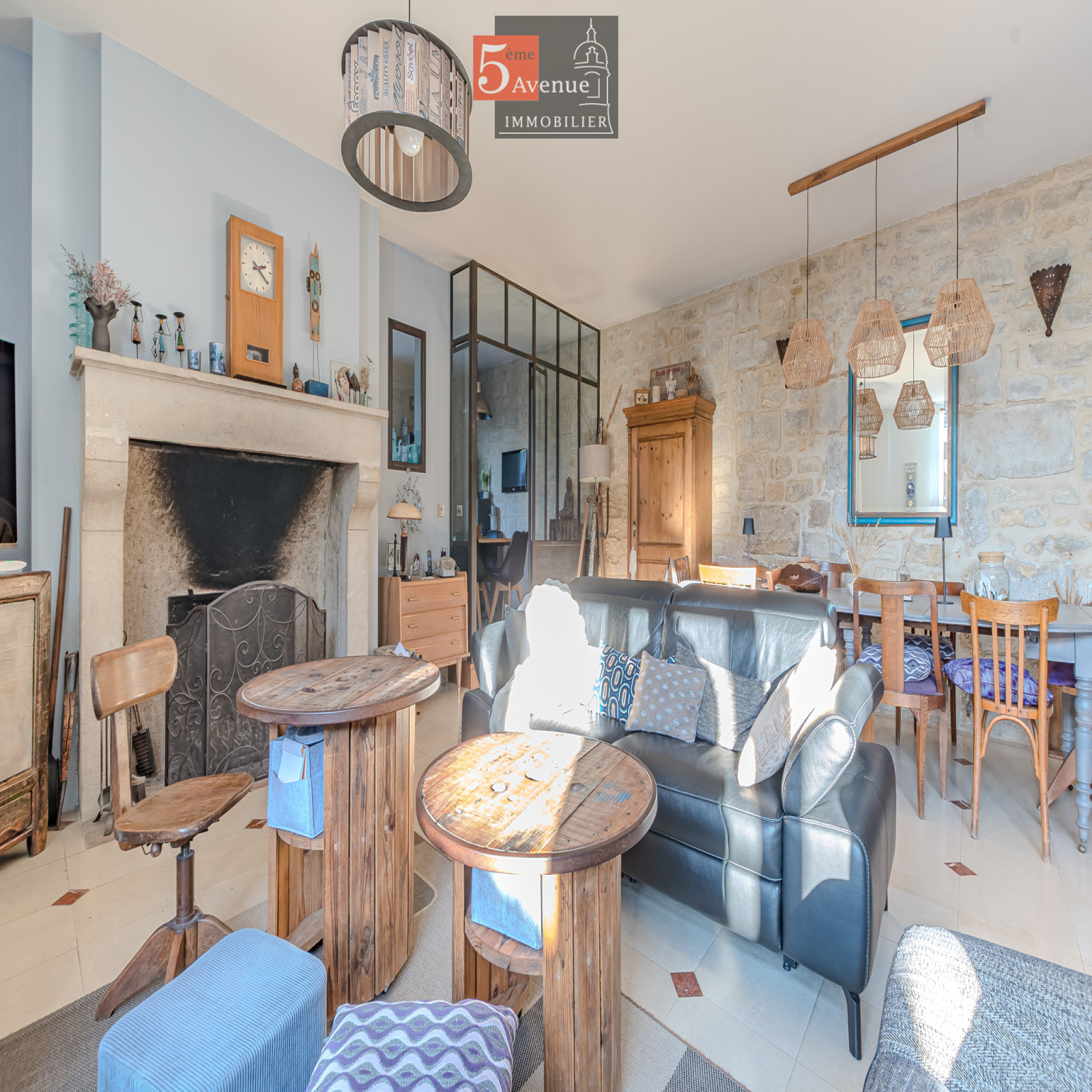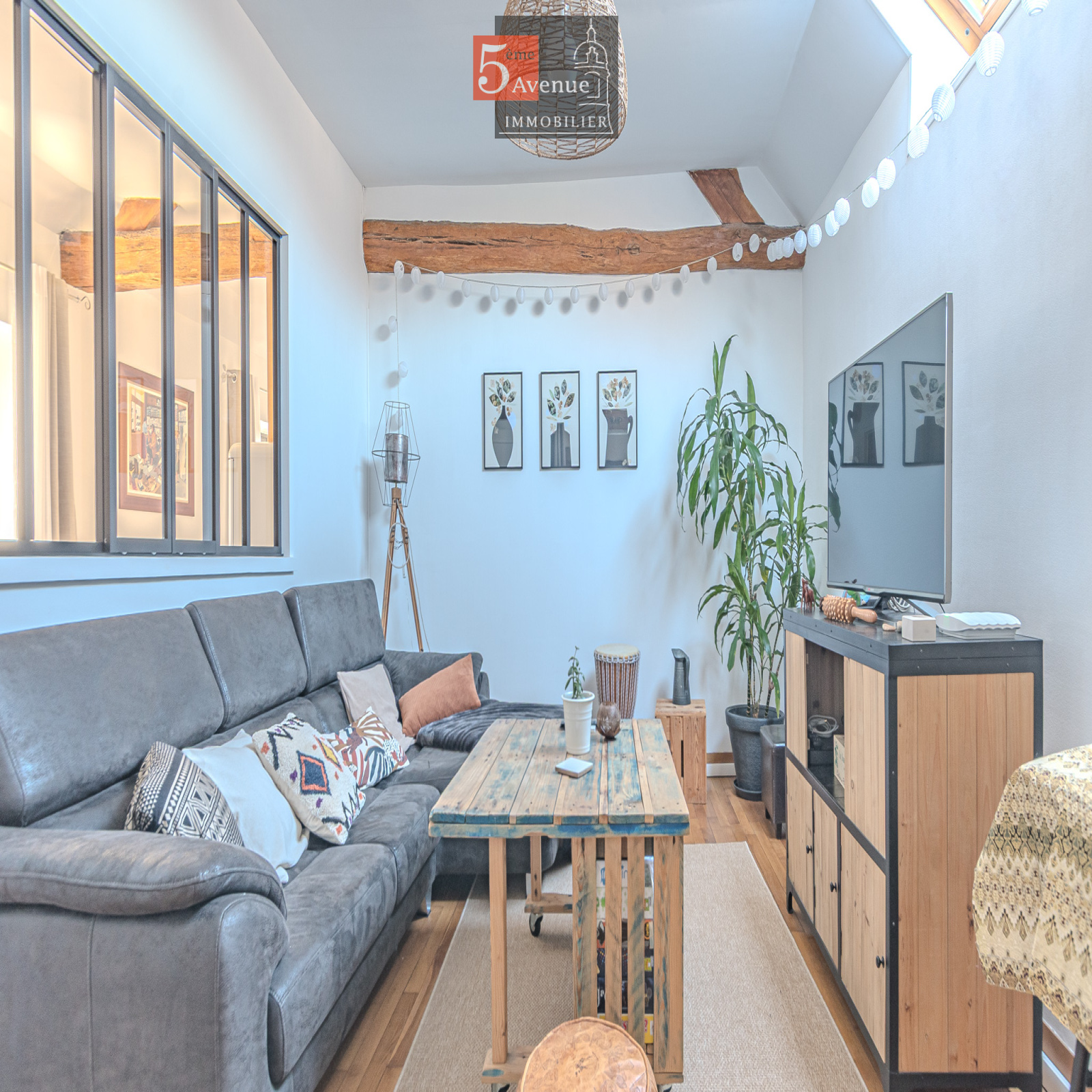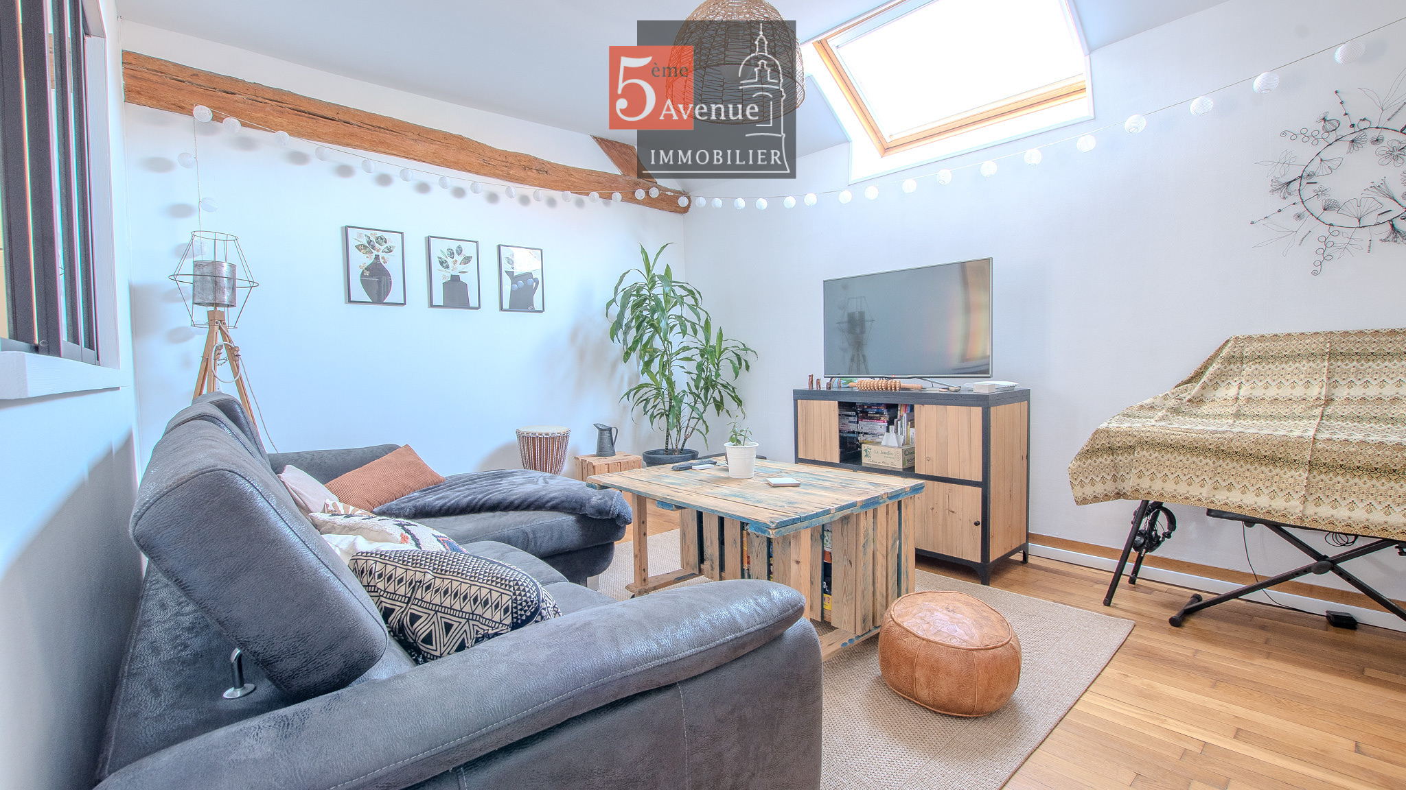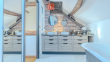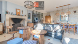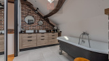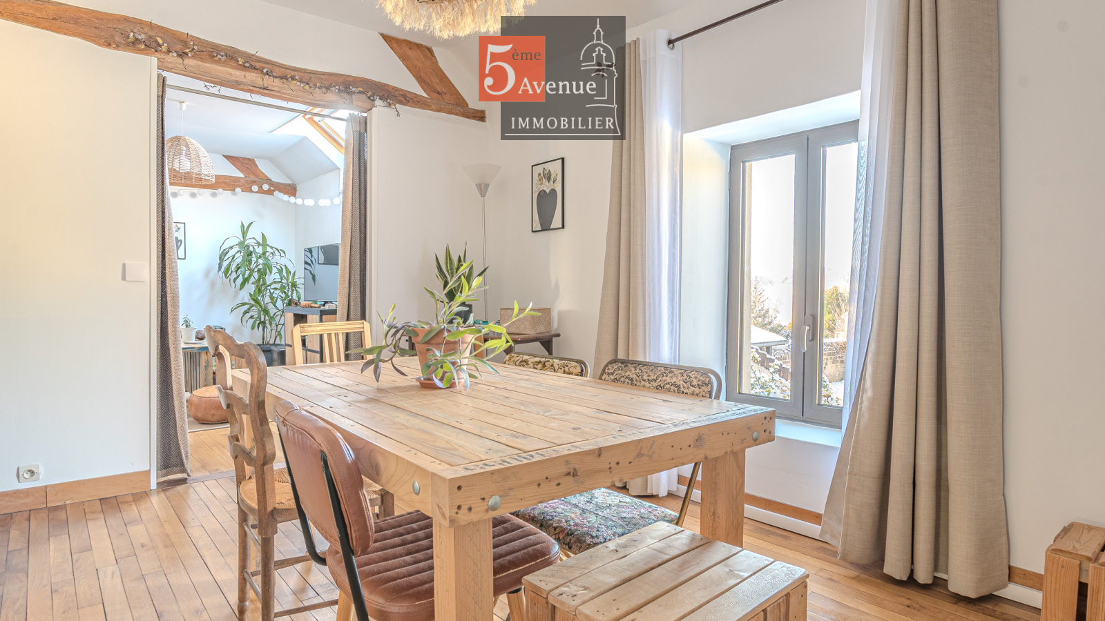 À l’étage, l’espace de vie surprend par ses volumes : un spectaculaire salon cathédrale de 75 m² aux poutres apparentes crée une atmosphère chaleureuse et lumineuse