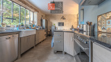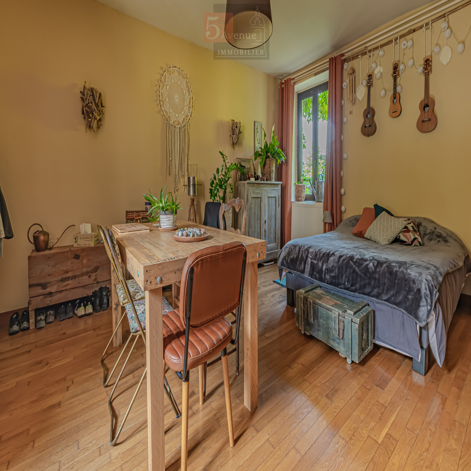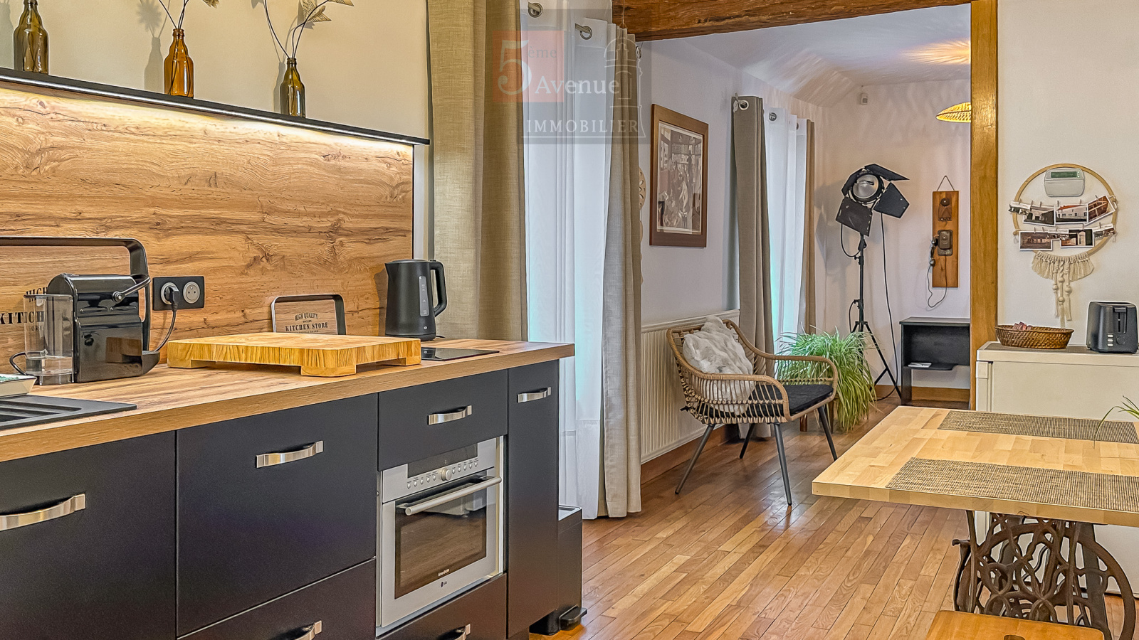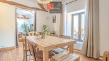 La première partie de l’habitation accueille, en rez-de-chaussée, une spacieuse salle à manger ouverte sur une cuisine fonctionnelle, prolongée par une arrière-cuisine.