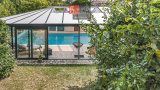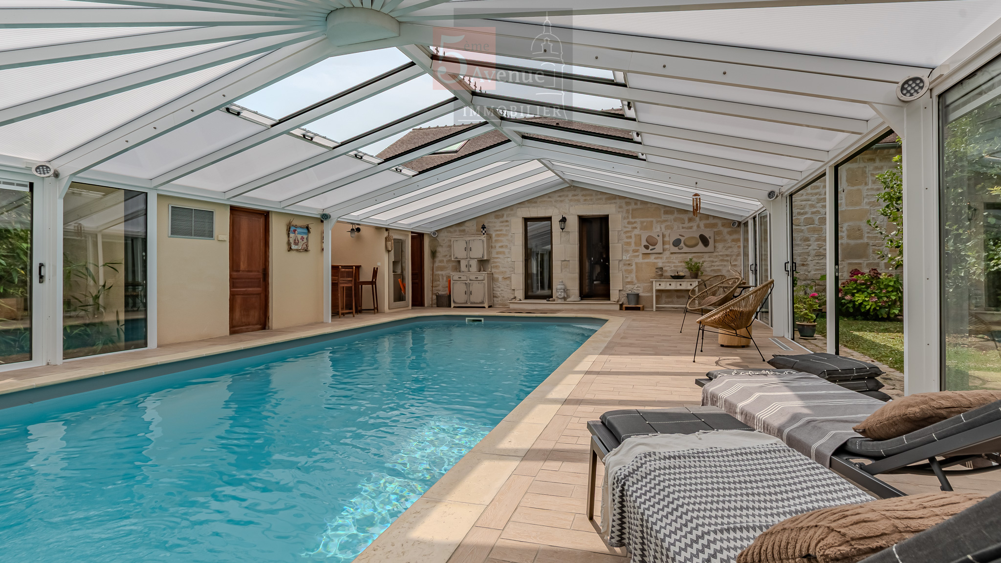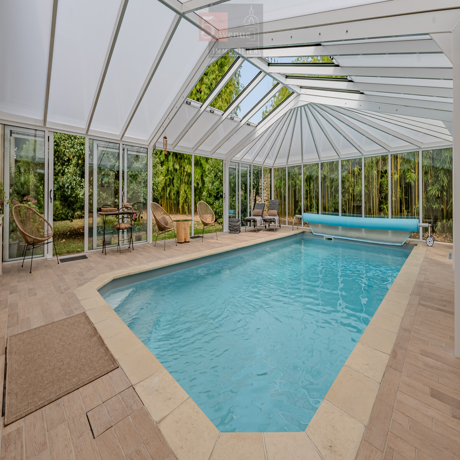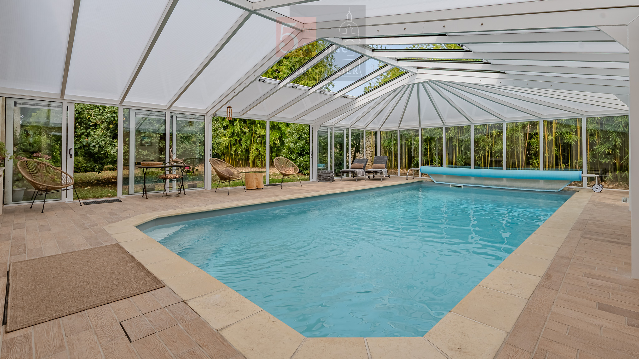 On accède à une vaste piscine intérieure sous véranda, véritable atout bien-être de la maison, accompagnée d’un espace bar.