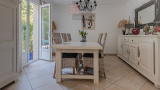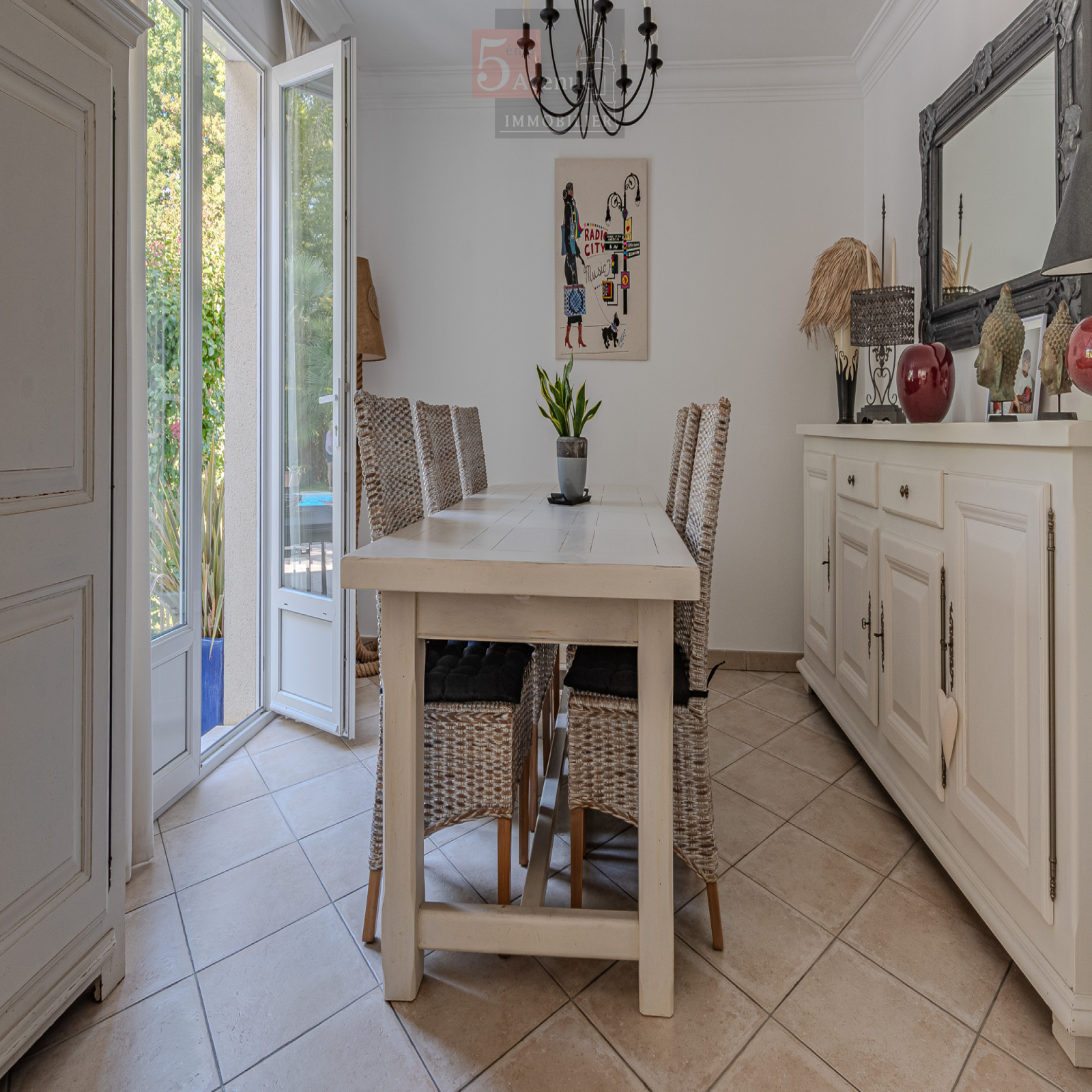 L’entrée s’ouvre sur une cuisine récente entièrement équipée, une salle à manger et un séjour très lumineux grâce à de larges baies vitrées donnant accès à la terrasse et à la piscine. Le rez-de-chaussée comprend également une cuisine d’été, une buanderie, une salle d’eau et une chambre.