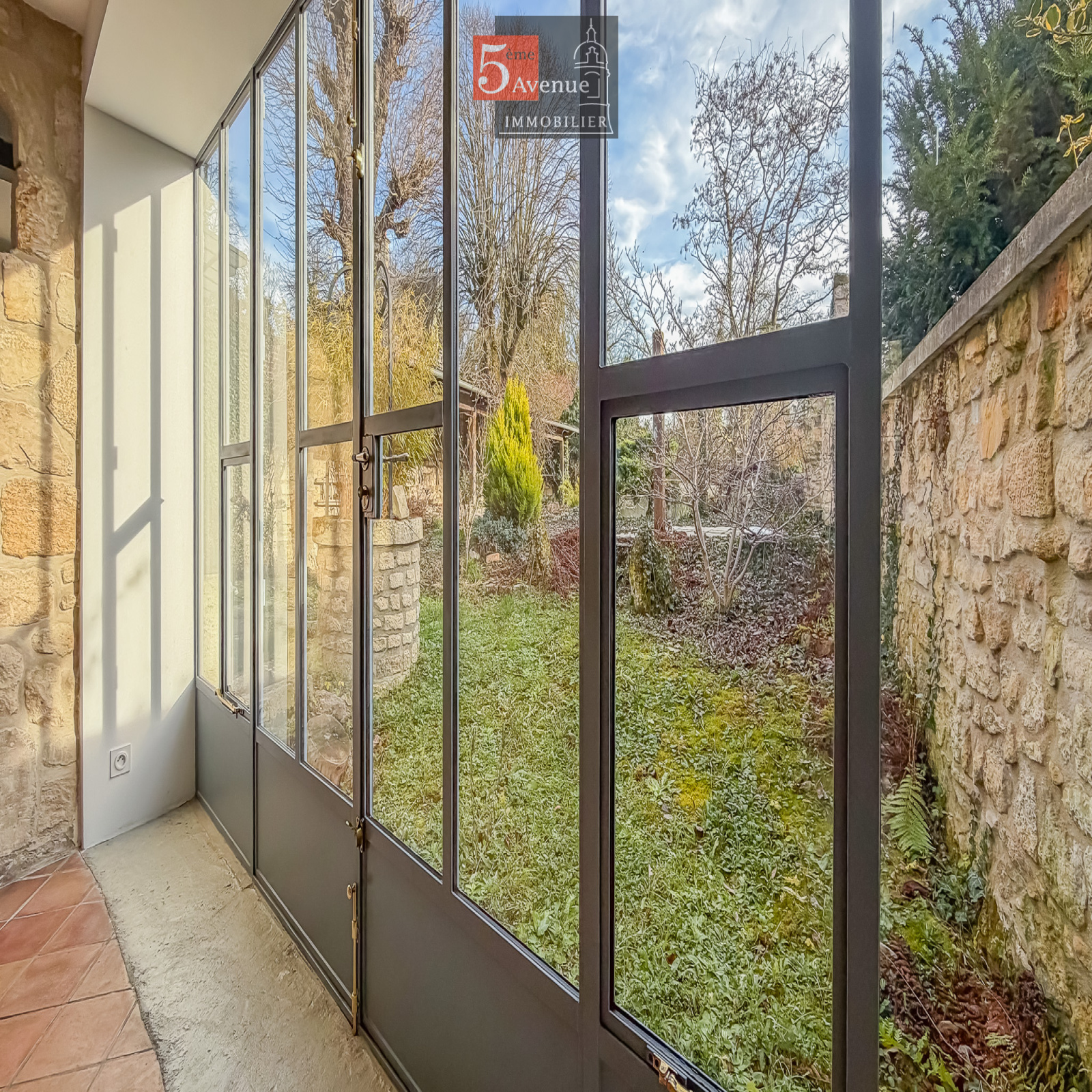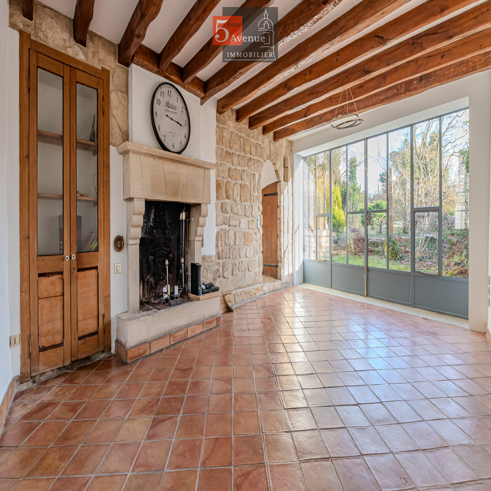 Cuisine entièrement équipée, magnifique séjour baigné de lumière avec poutres apparentes et cheminée en pierres. Sa grande baie vitrée offre une vue directe sur le jardin arboré.