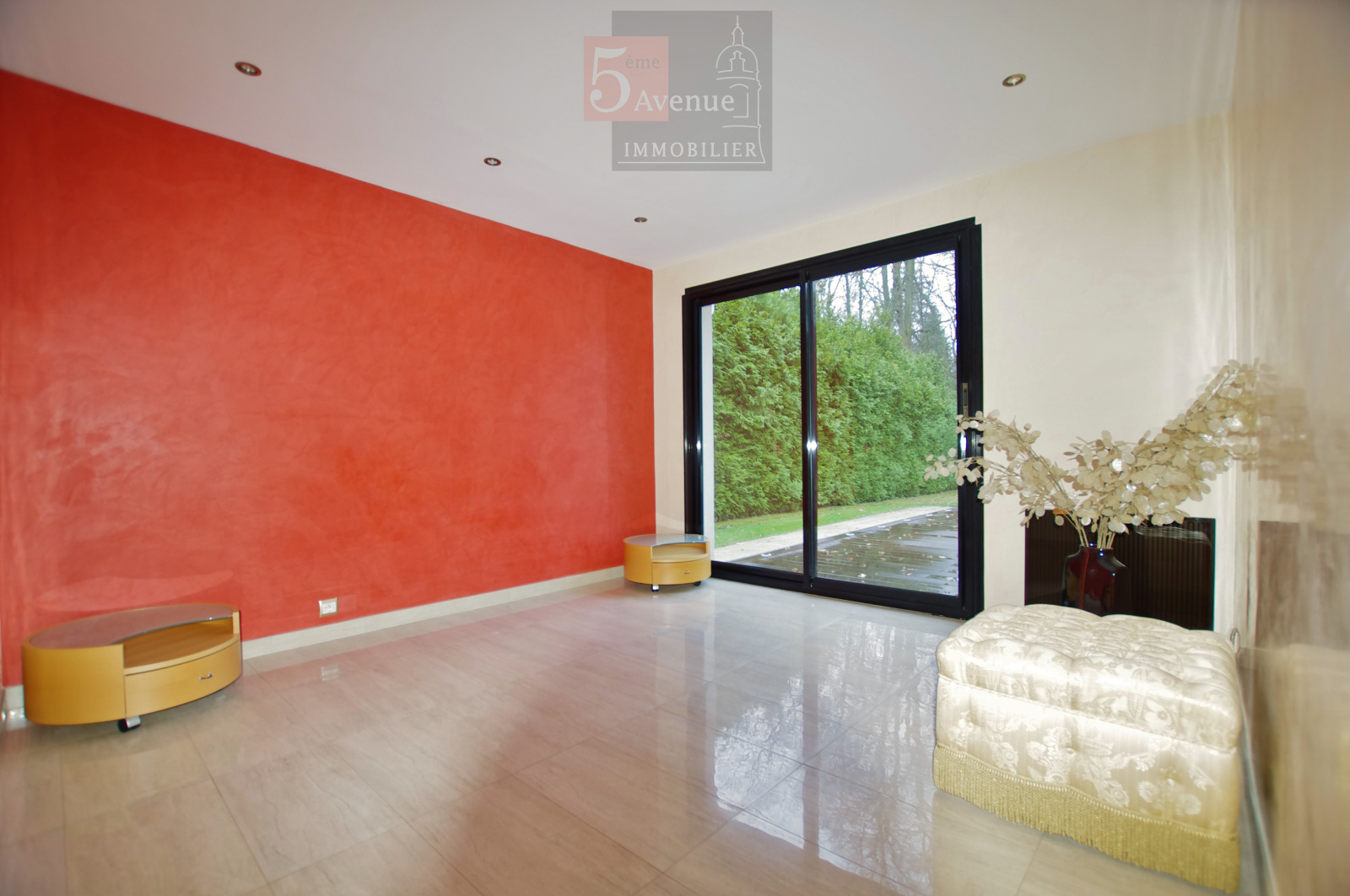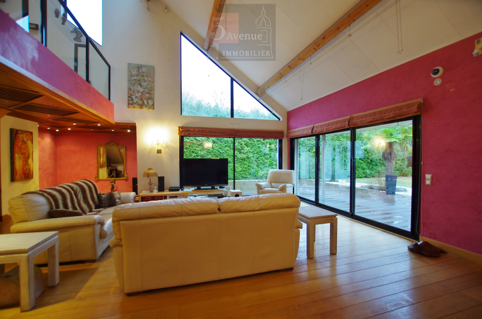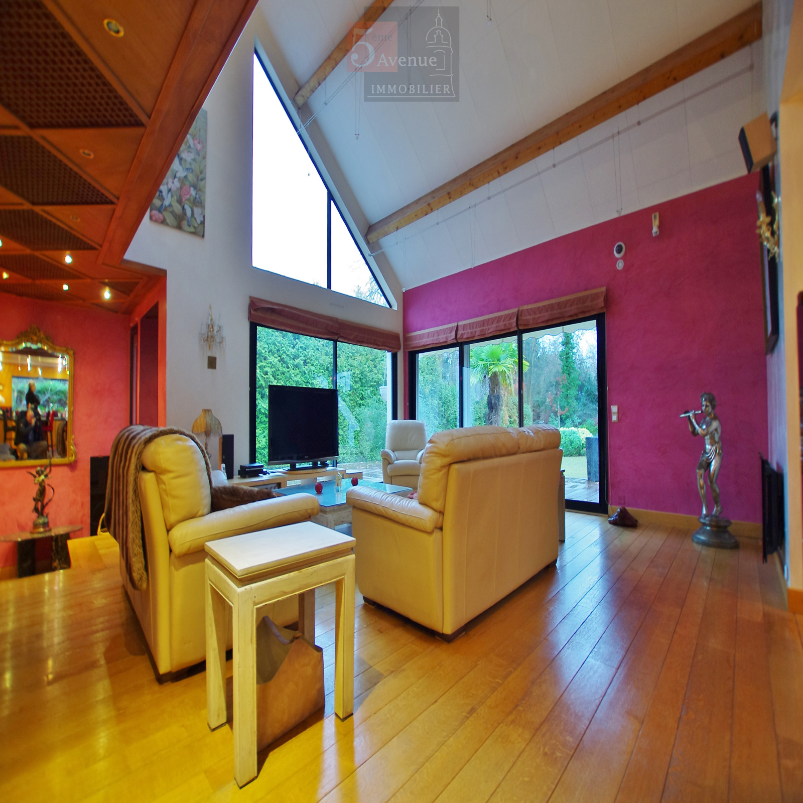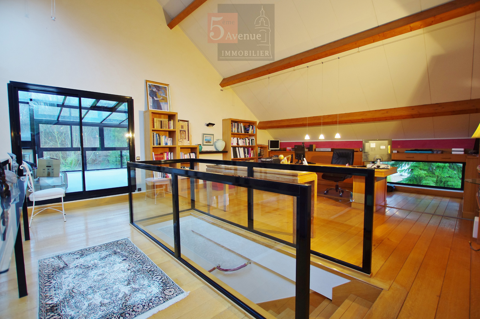 Magnifique maison d'architecte à Lamorlaye sur un parc boisé de 3000m², résolument moderne, spacieuse et lumineuse offrant un vaste séjour avec grande baies vitrées donnant sur le parc, salon, cuisine équipée, deux chambres, salle de bains et une suite avec salle de bains. A l'étage une mezzanine de 44m² avec une très belle hauteur sous plafond et une suite parentale avec salle de bains, grande pièce de 39m² à aménager sous verrière. Sous-sol partiel avec garage deux véhicules et cave à vins. Une très belle maison au calme à découvrir à l'agence 5ème Avenue Immobilier de Chantilly