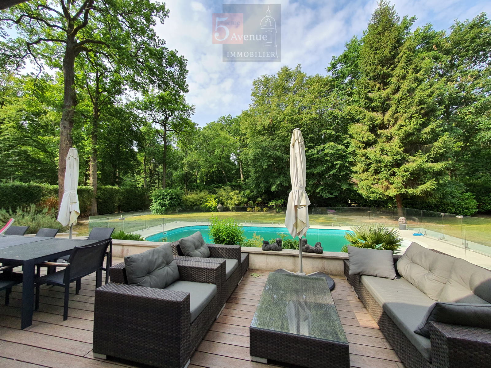 Villa contemporaine d'environ 190m² sur 3 939m² de jardin clos et arboré à Lamorlaye. Entrée, salon, salle à manger avec accès sur la terrasse surplombant la piscine, cuisinée équipée indépendante, très belle suite parentale de plus 40m² avec salle d'eau et coin salon. A l'étage 4 chambres dont deux traversante, salle de bains. Sous-sol total carrelé, très belle piscine au coeur d'un écrin de verdure, cadre idyllique, golf accessible à pieds.