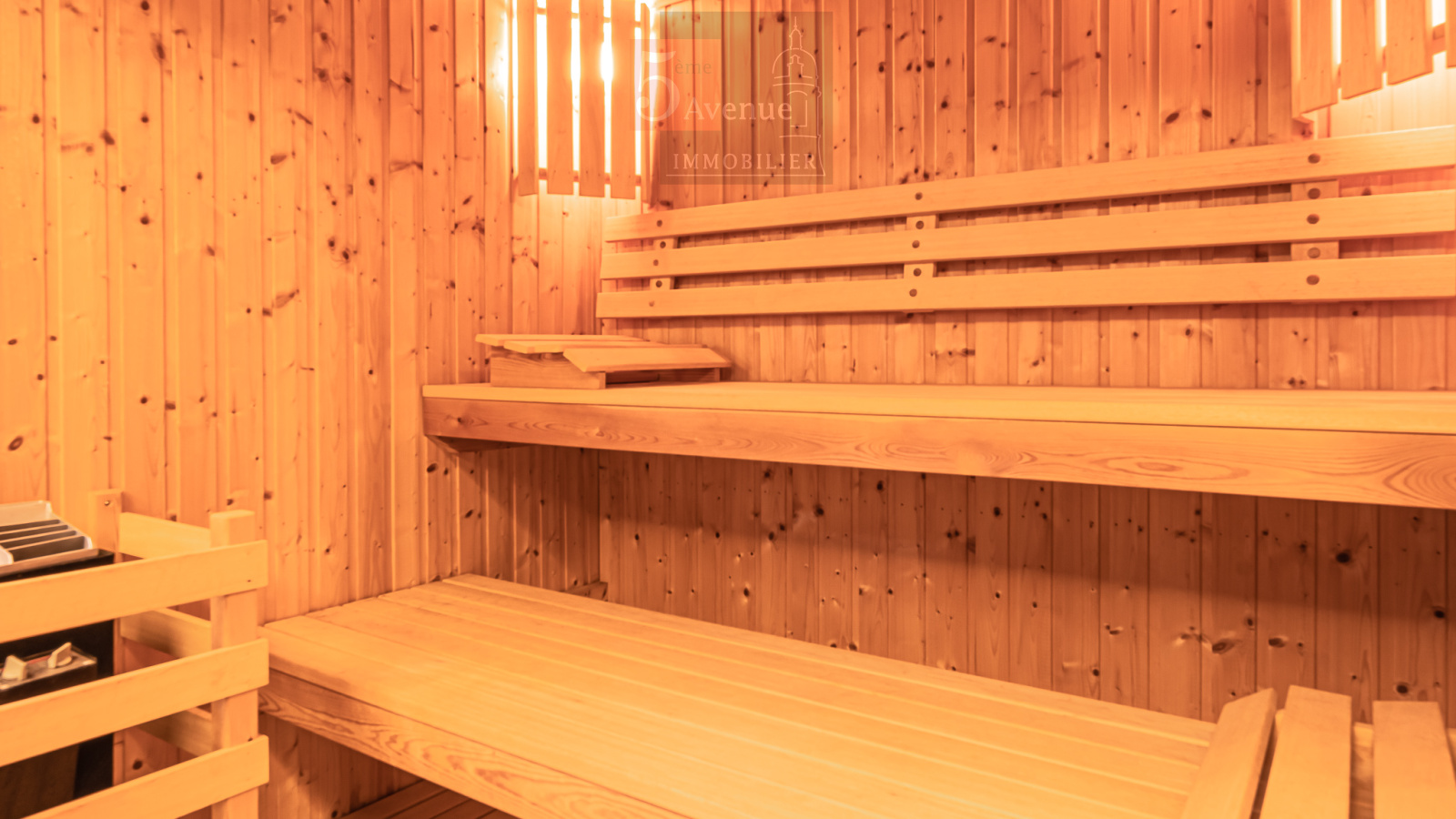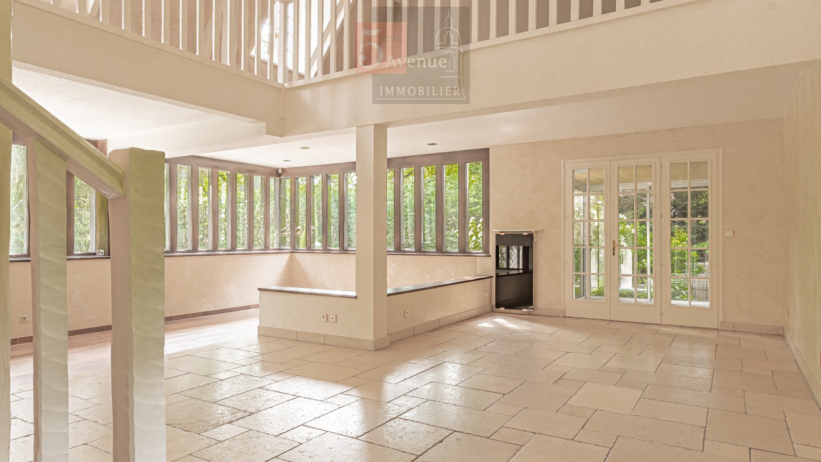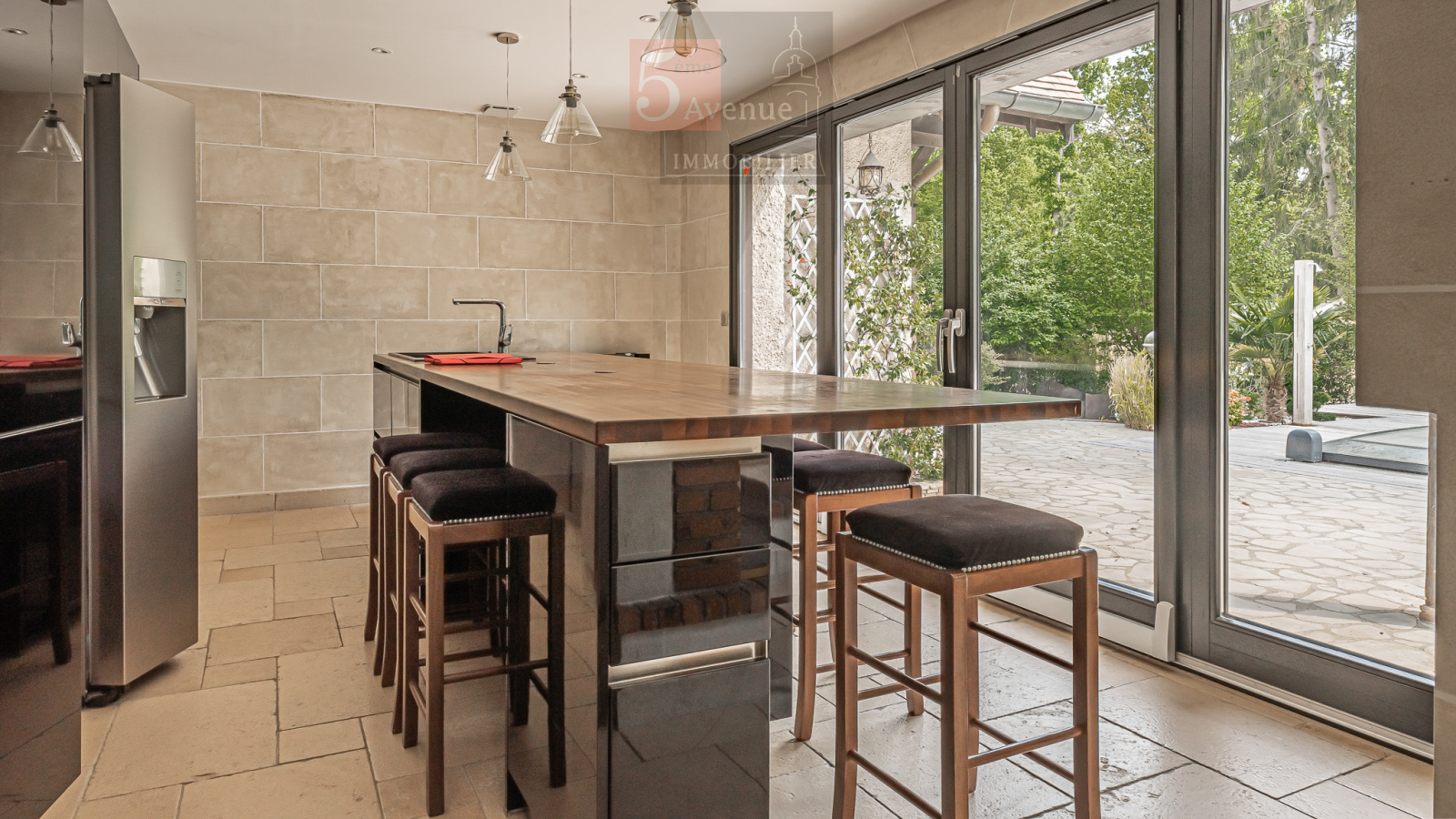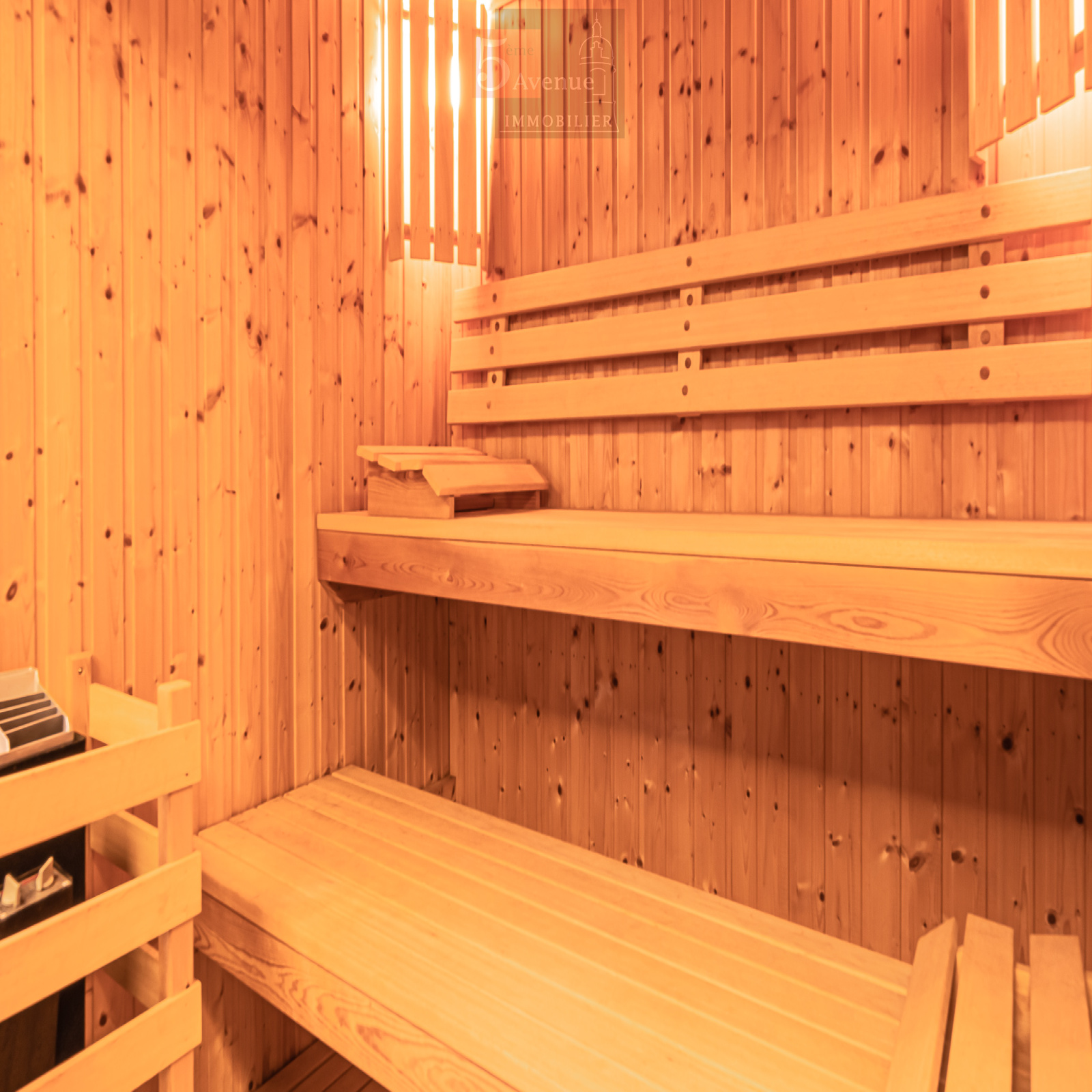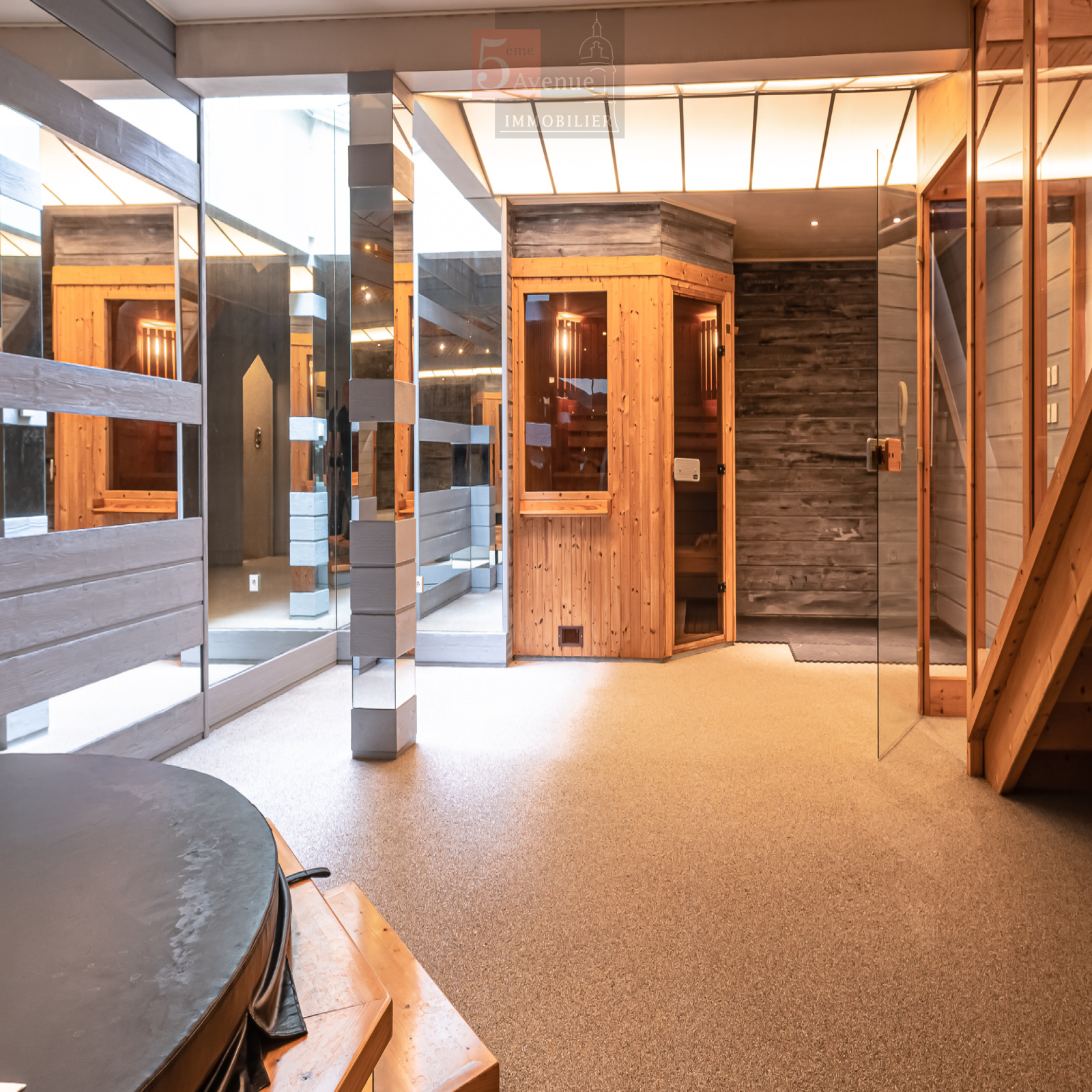 L'entrée vous amène à une première double réception avec cheminée et cuisine moderne entièrement équipée, la grande baie vitrée vous donne une vue panoramique sur le parc et l'accès à la terrasse et la piscine. Une seconde réception plus intimiste en prolongement avec un accès direct en souplex à une pièce aménagée en salle de sport, spa et sauna.