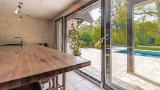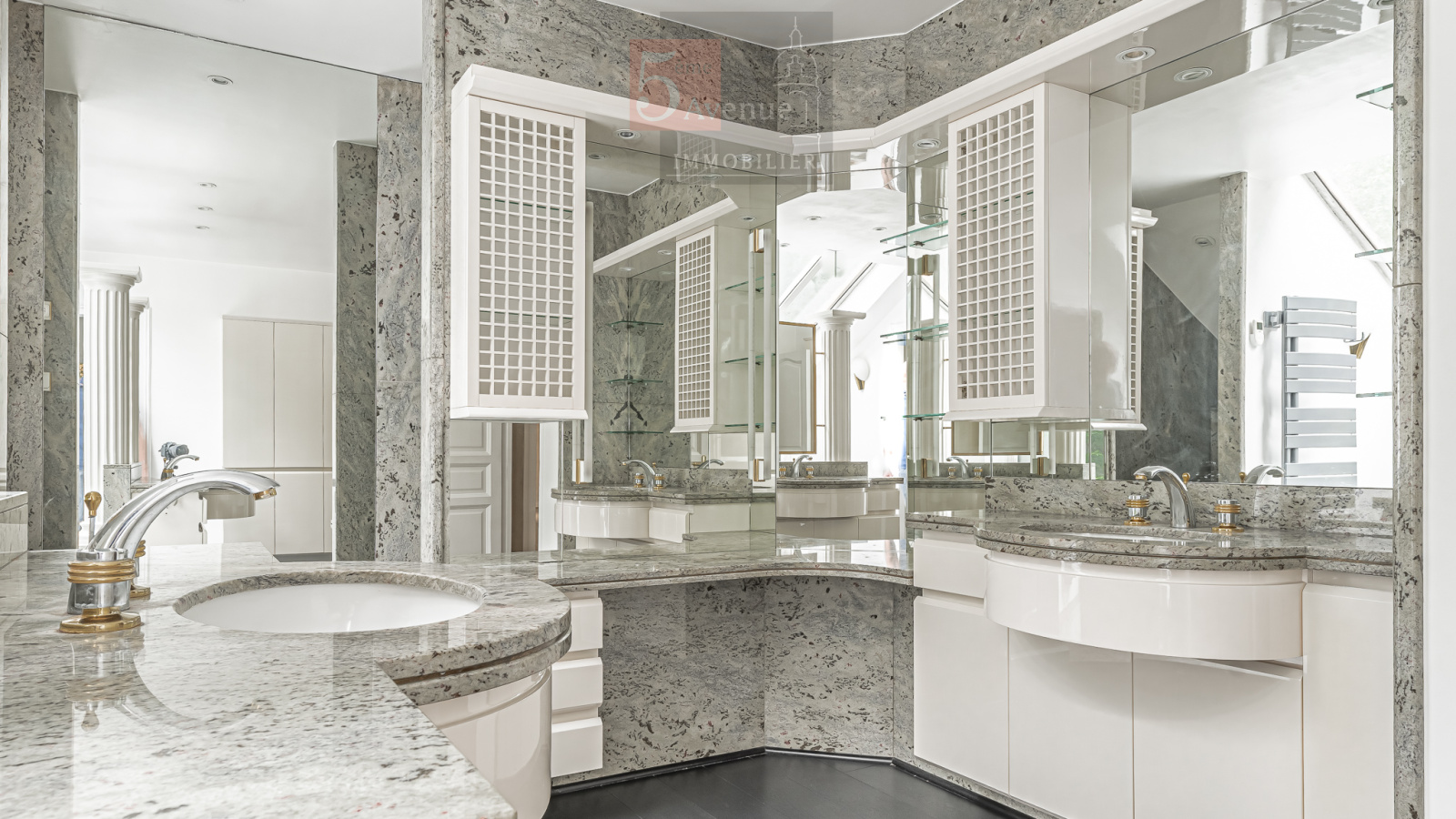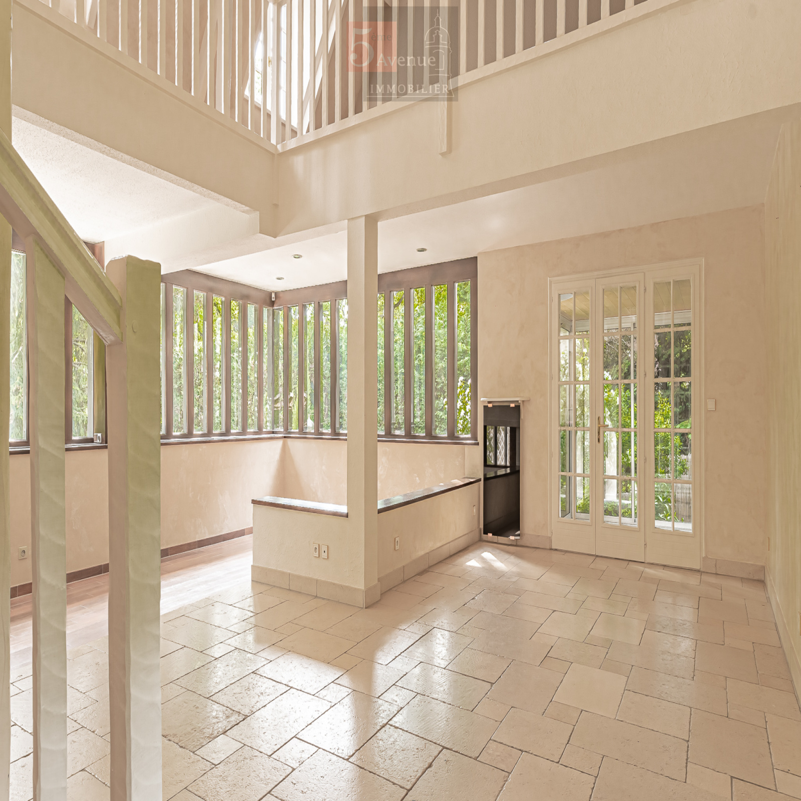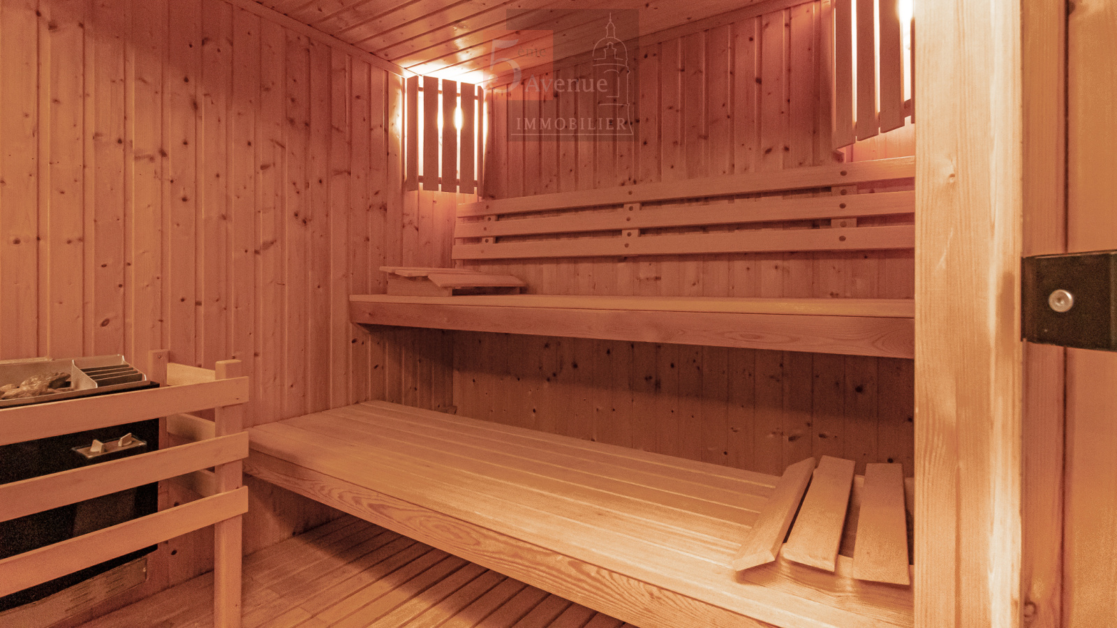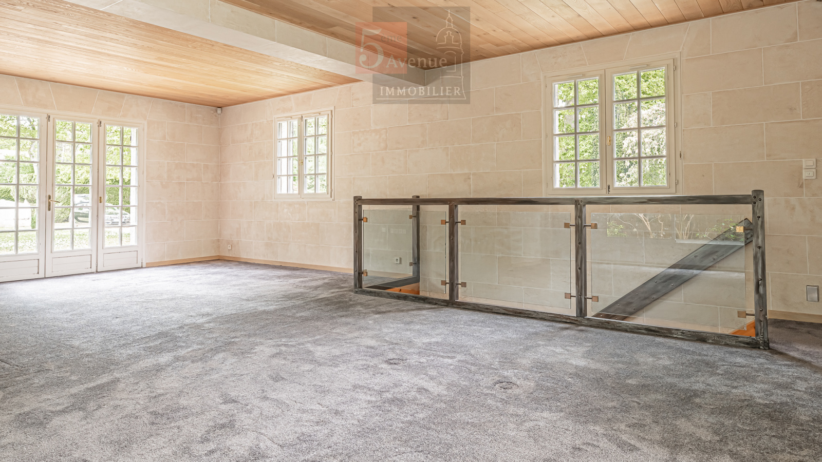 L'entrée vous amène à une première double réception avec cheminée et cuisine moderne entièrement équipée, la grande baie vitrée vous donne une vue panoramique sur le parc et l'accès à la terrasse et la piscine. Une seconde réception plus intimiste en prolongement avec un accès direct en souplex à une pièce aménagée en salle de sport, spa et sauna.