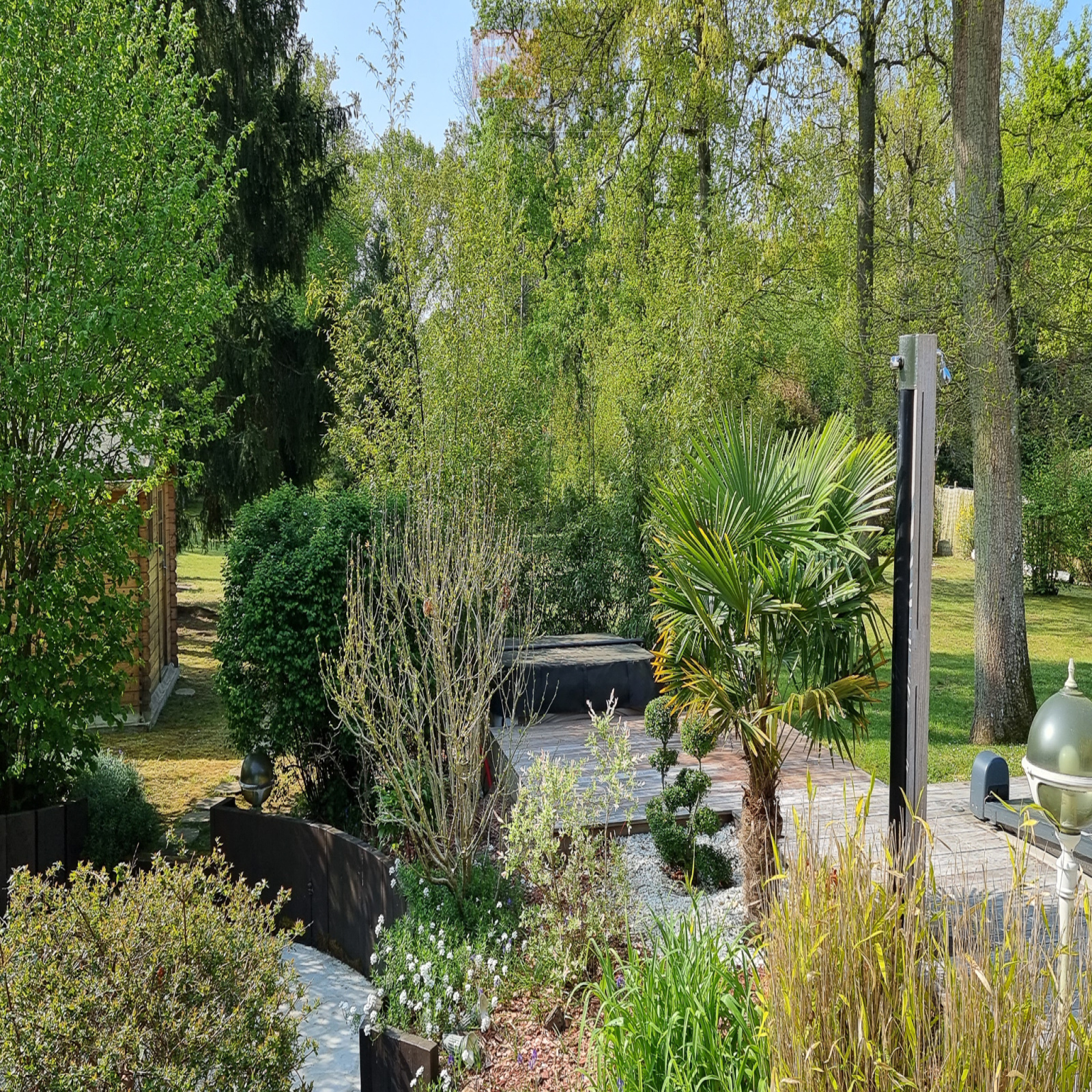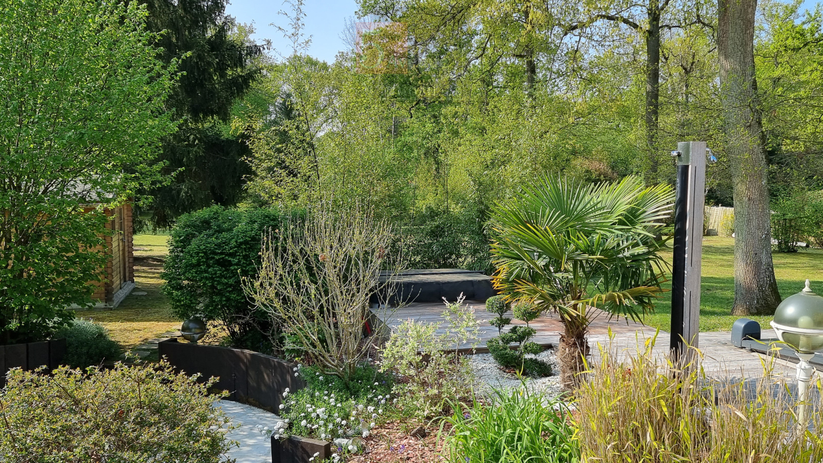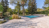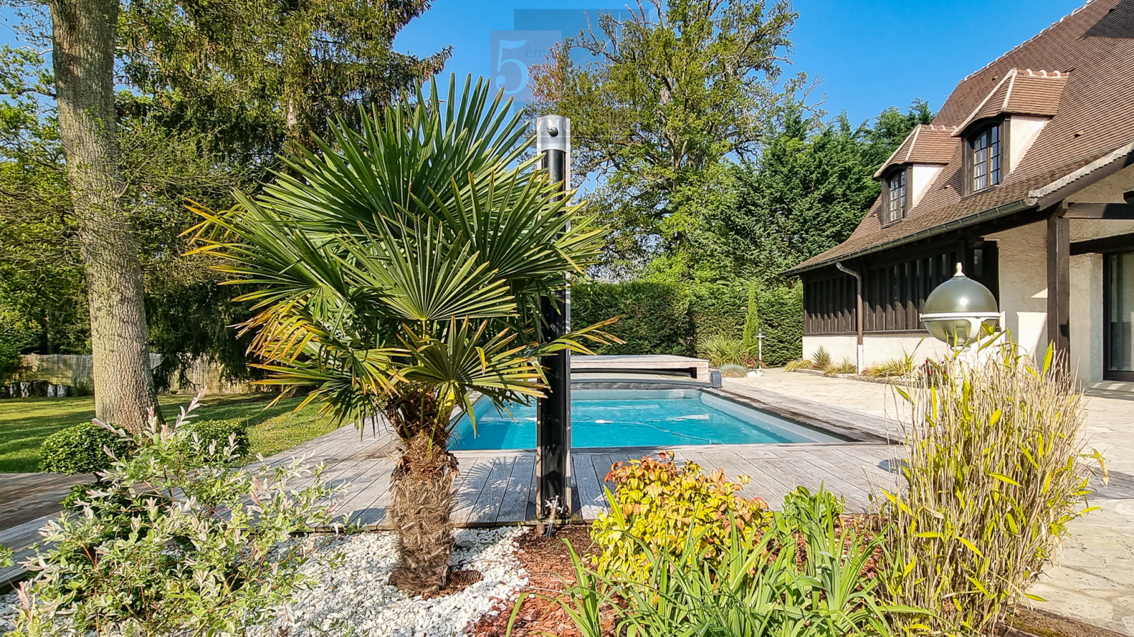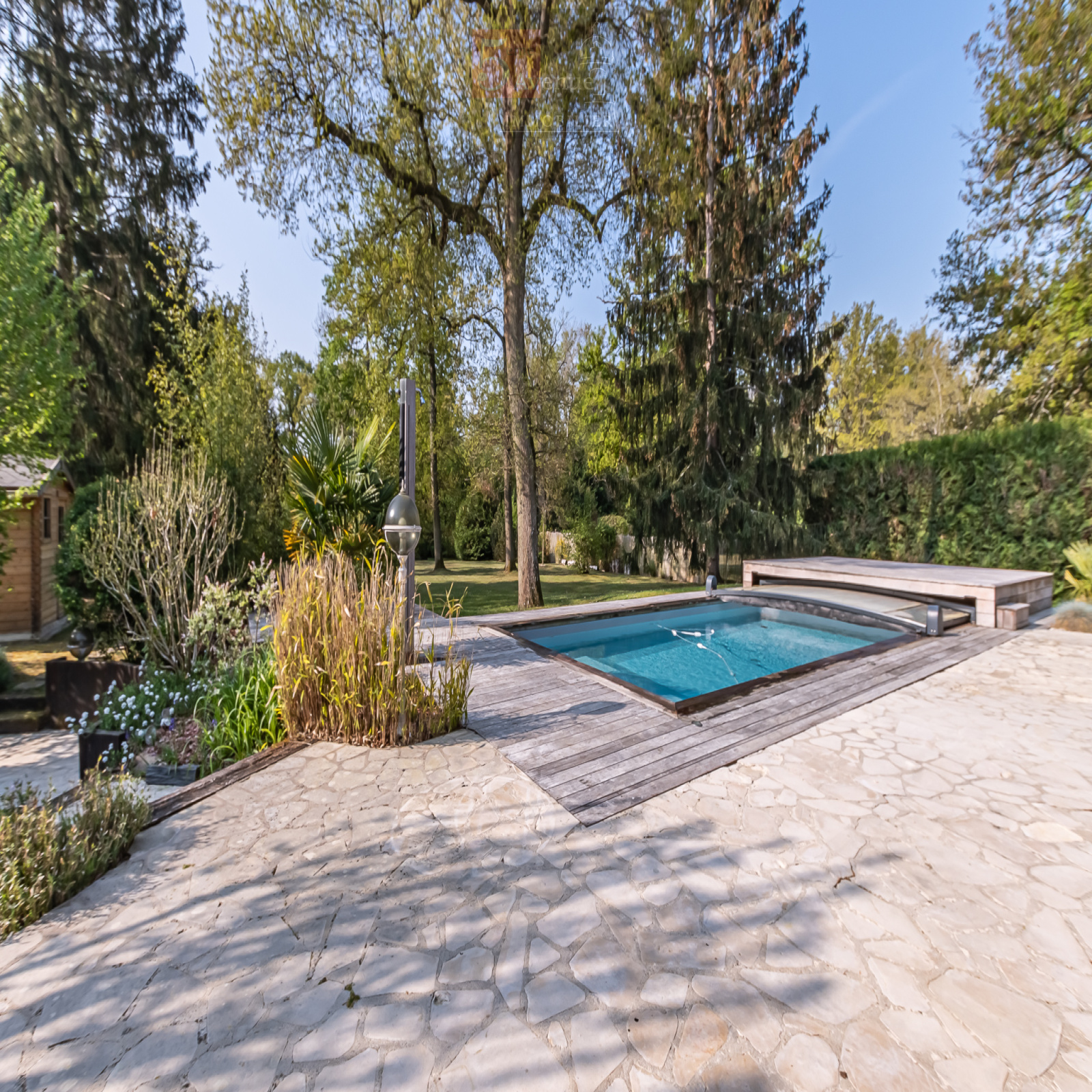 La partie jardin a été entièrement réaménagé recemment et dispose d'une belle et vaste terrasse en bois avec une piscine récente ( 3 ans avec couverture motorisé), espace jacuzzi et parc entièrement arboré exposé sud.