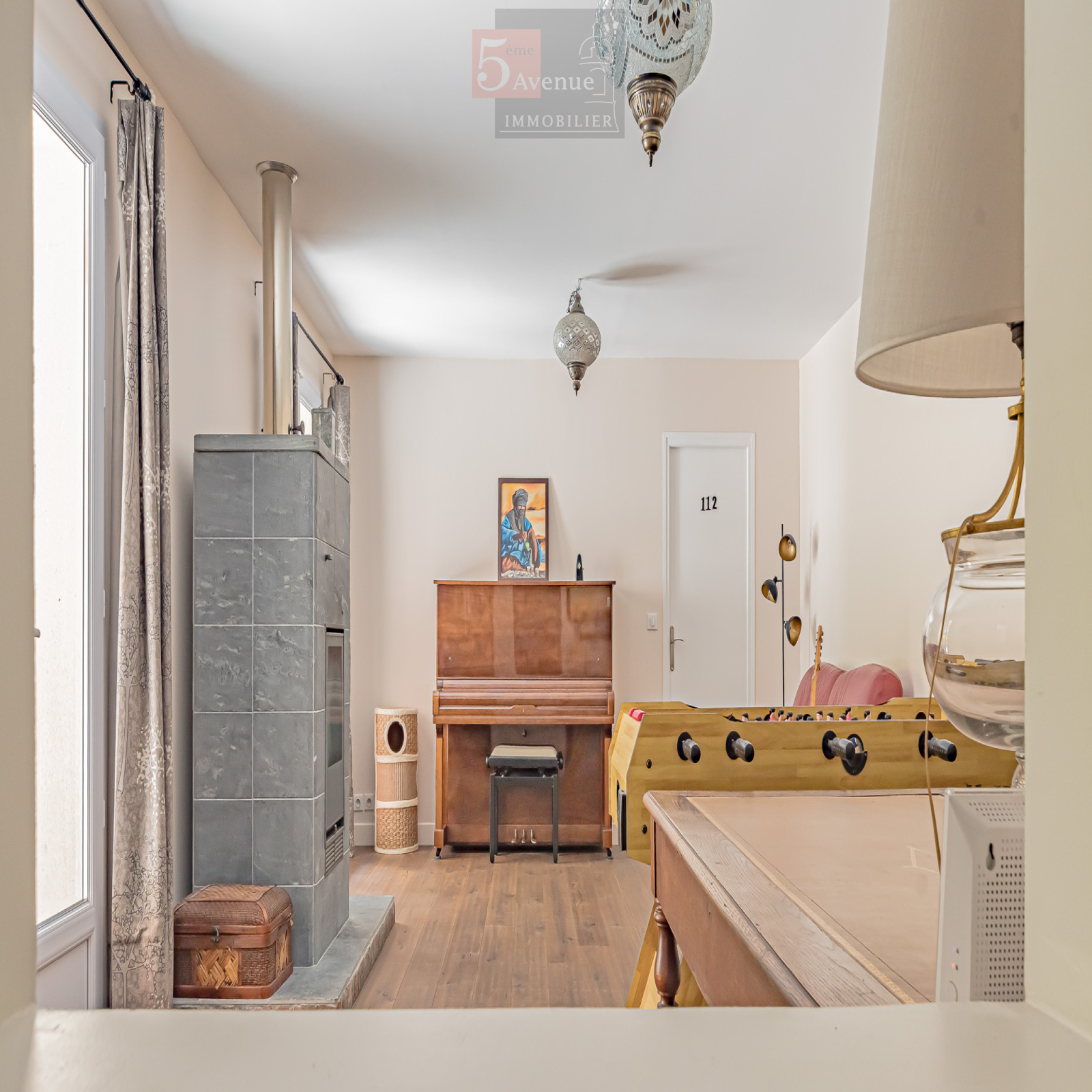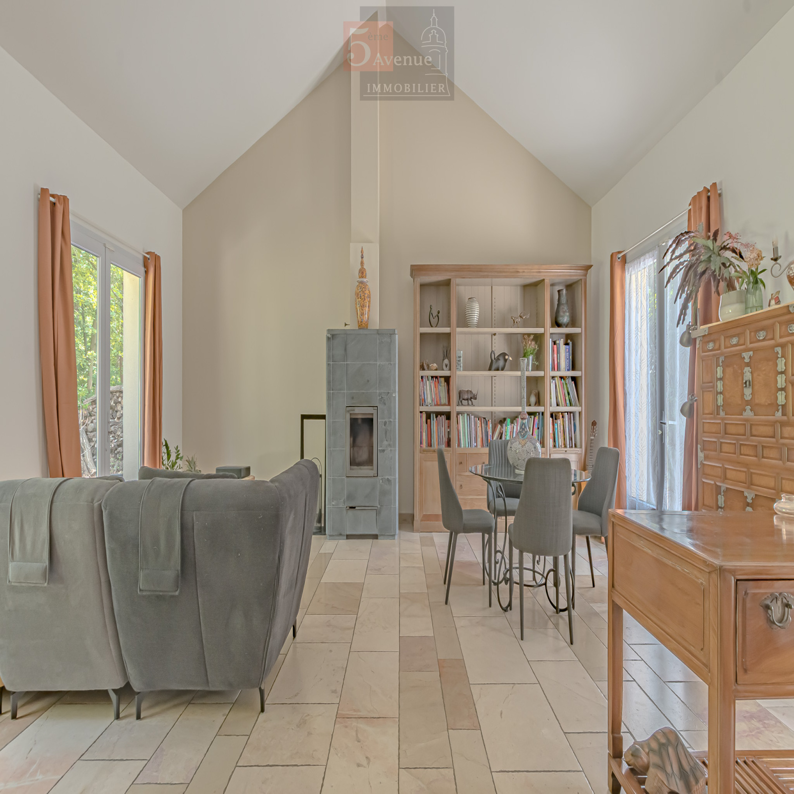 Au rez-de-chaussée, vous serez accueilli par une grande entrée avec placard. Le salon principal, baigné de lumière grâce à sa hauteur cathédrale, offre plus de 42 m² et dispose d’un poêle à bois à accumulation de chaleur, cuisine récente, ouverte sur la salle à manger.
