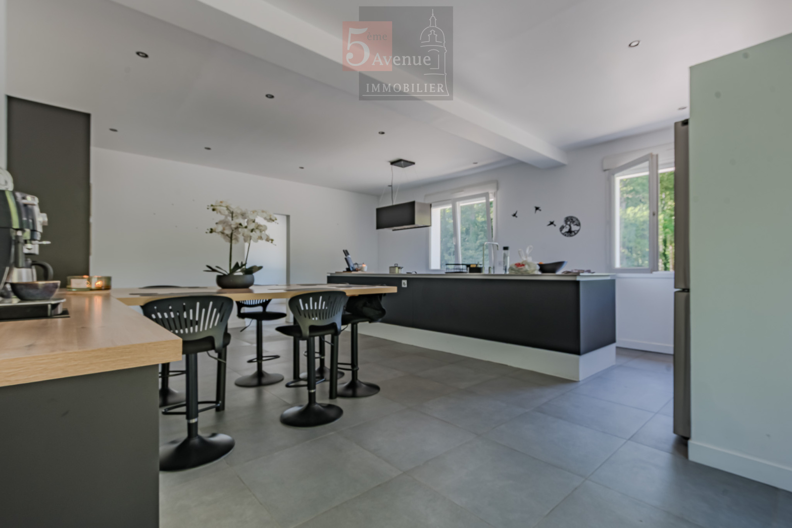Dès l’entrée, vous serez séduit par les volumes impressionnants de cette maison. Le séjour de 75 m², baigné de lumière grâce à de nombreuses baies vitrées, constitue le cœur de la maison. Dans son prolongement, une vaste cuisine dinatoire entièrement équipée de plus de 40 m² donne accès à une salle à manger conviviale, idéale pour recevoir.