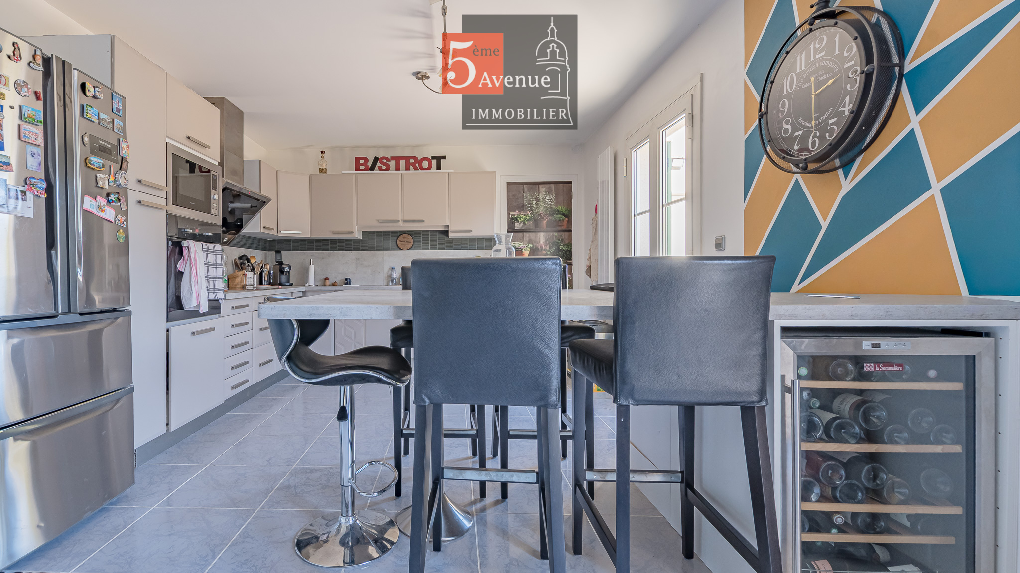L’entrée ouvre sur un spacieux espace de vie comprenant une grande cuisine dinatoire, un salon chaleureux équipé d’un poêle à bois, ainsi qu’une salle à manger.