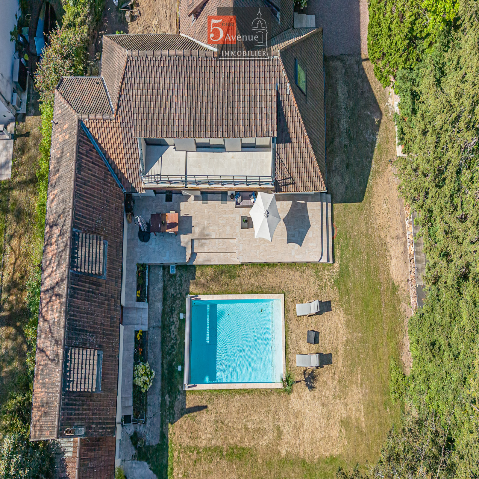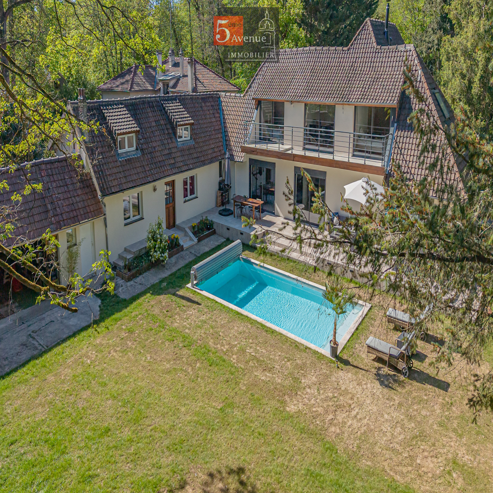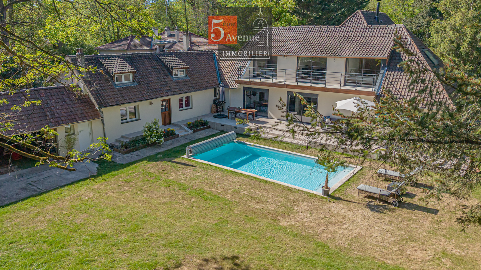 Édifiée sur un superbe terrain arboré de 2 830 m² sans vis-à-vis, elle dispose d’extérieurs privilégiés avec piscine chauffée, terrasse ensoleillée exposée sud / sud-est, pool house, carport avec borne de recharge et espaces de stationnement.