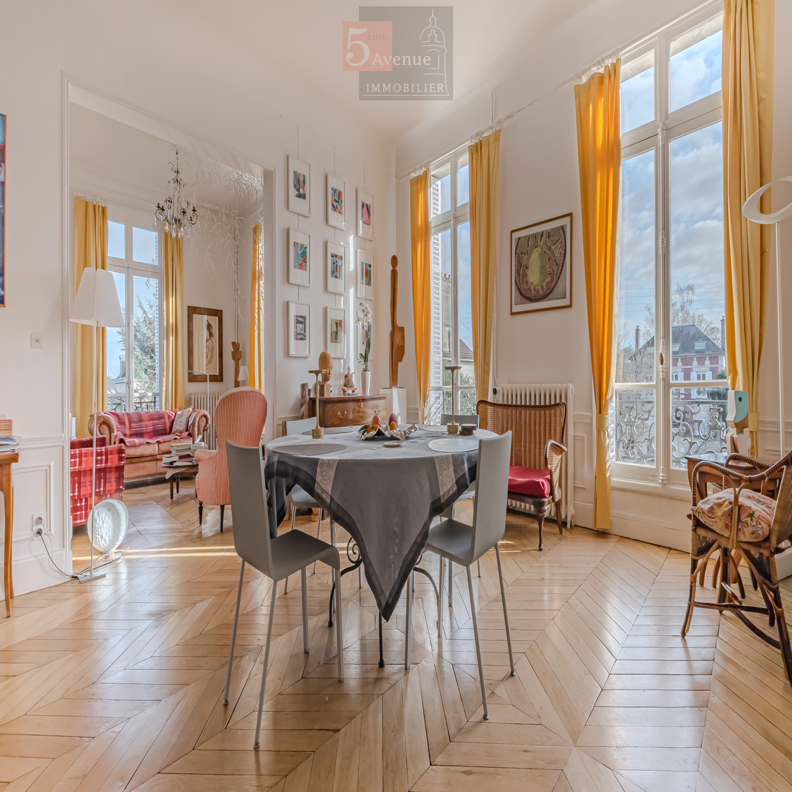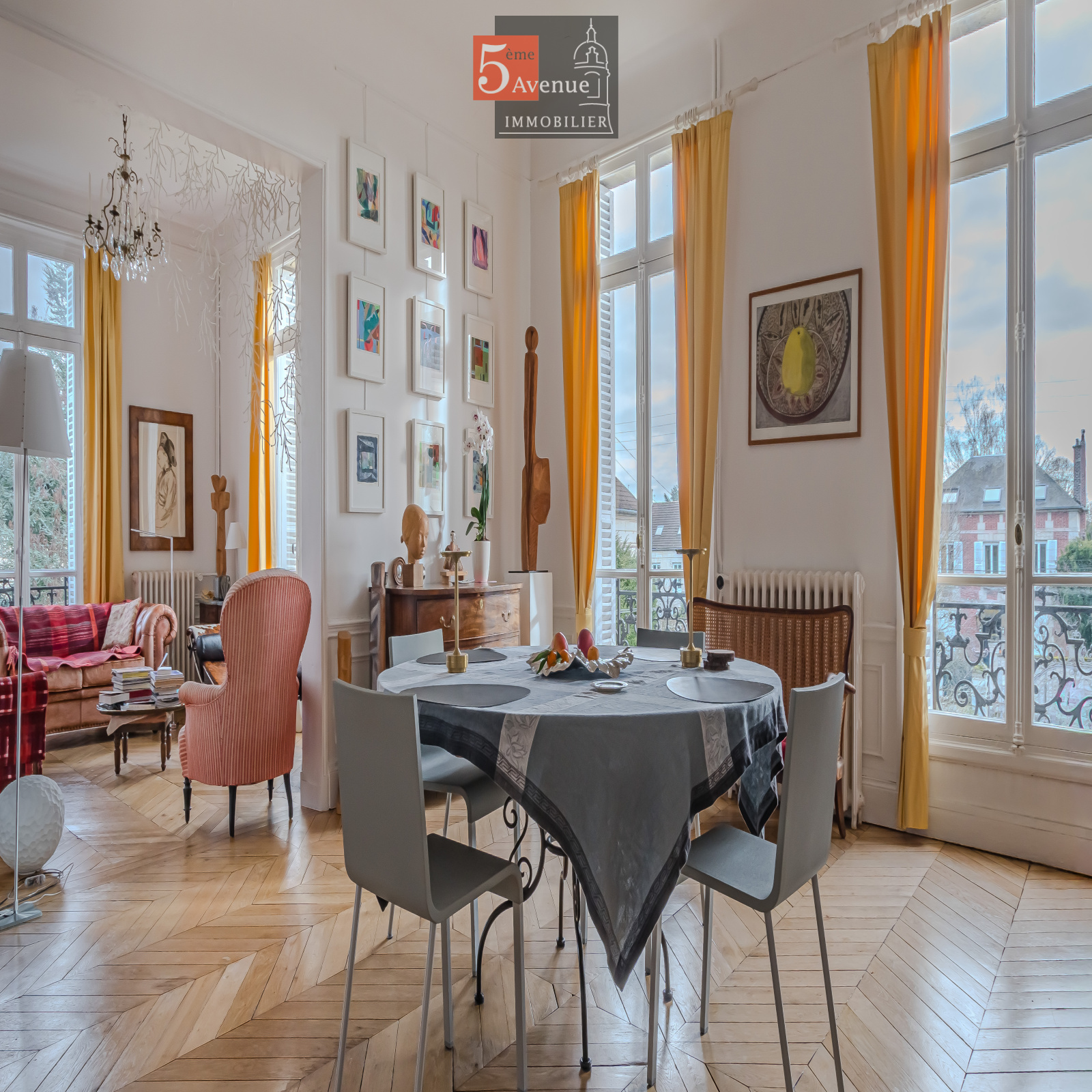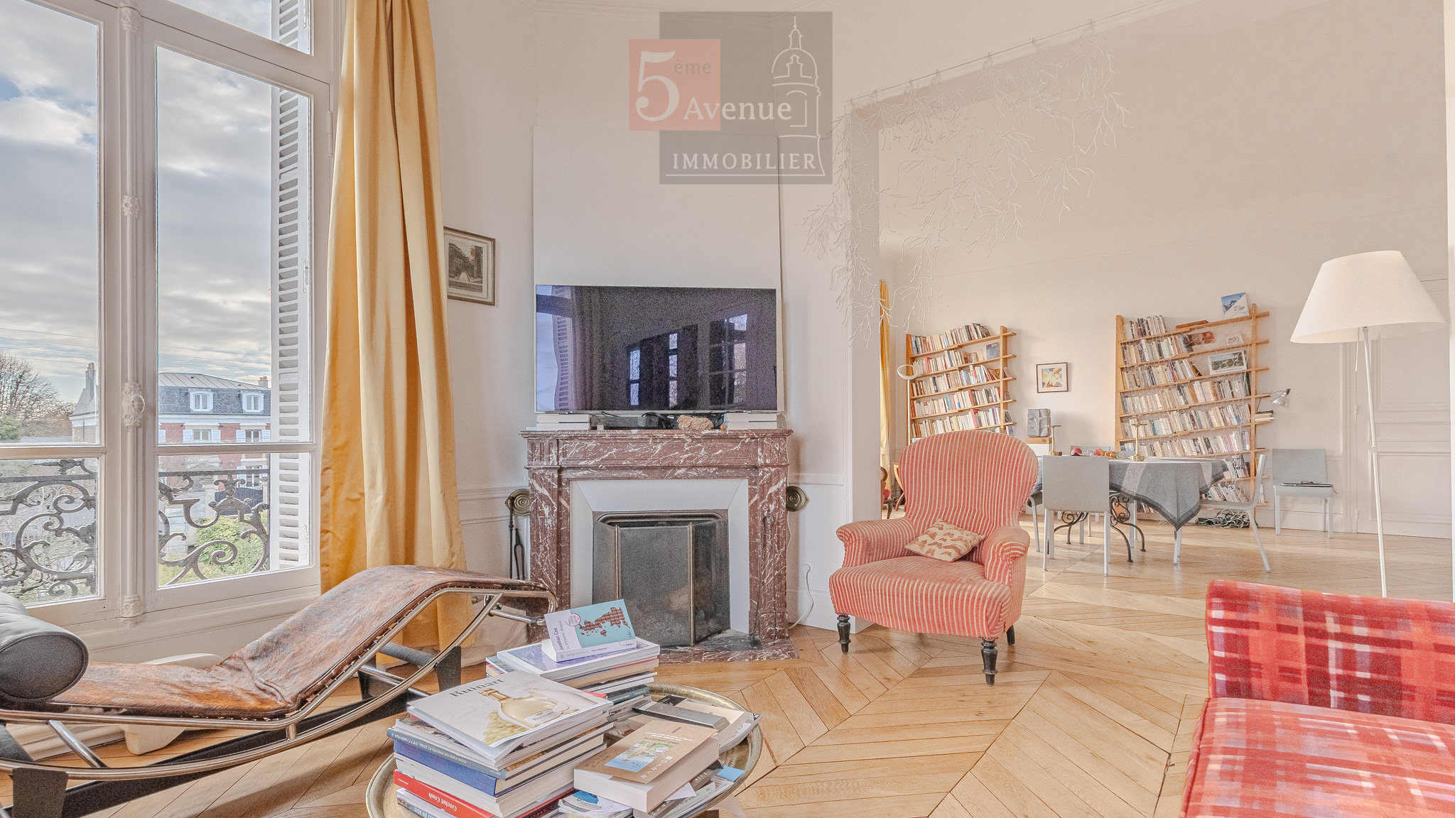 On y retrouve tous les codes de l'ancien : moulures, parquet en chêne, hauteur sous plafond et une cheminée fonctionnelle apportant un charme authentique à l’ensemble.