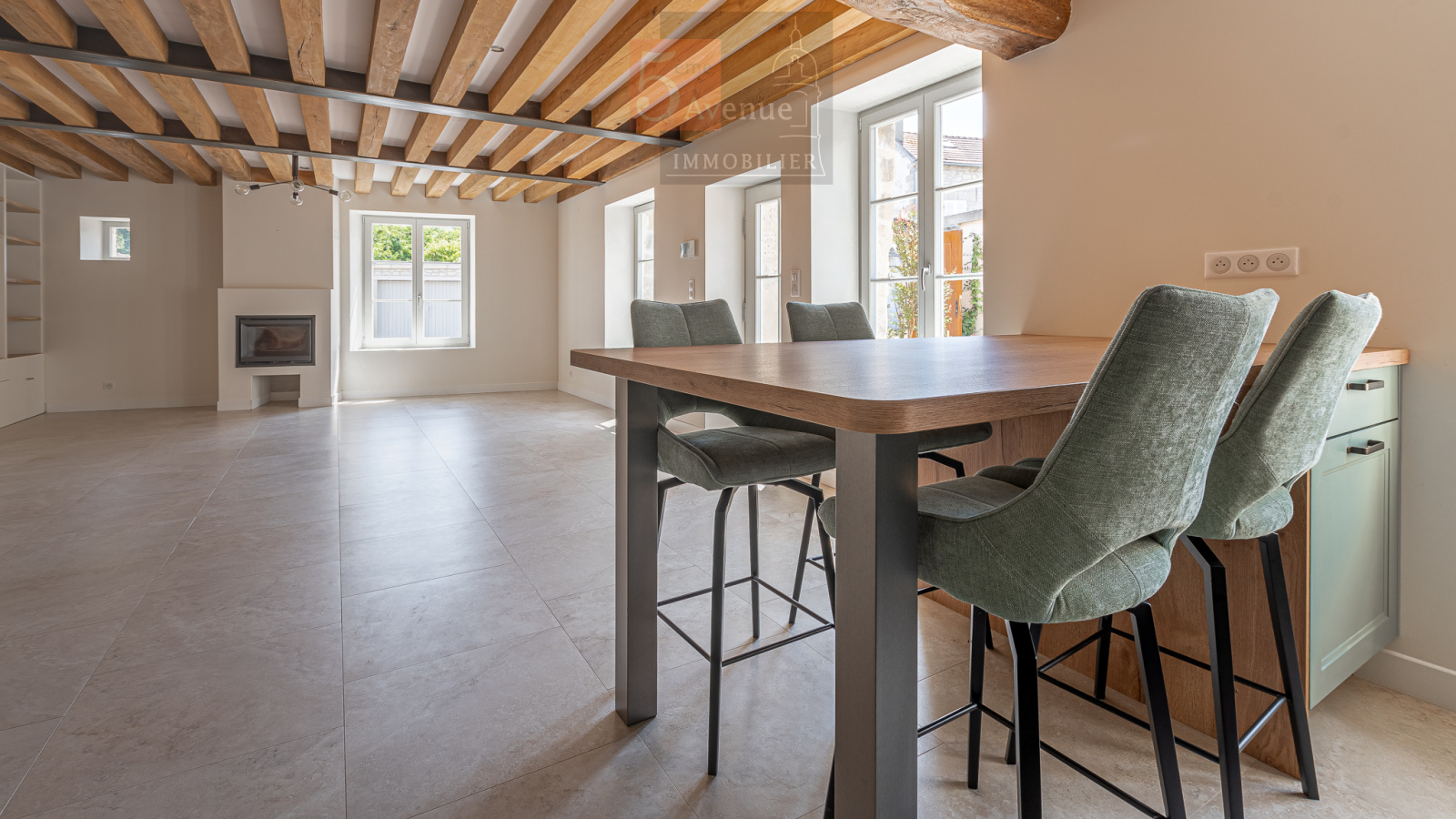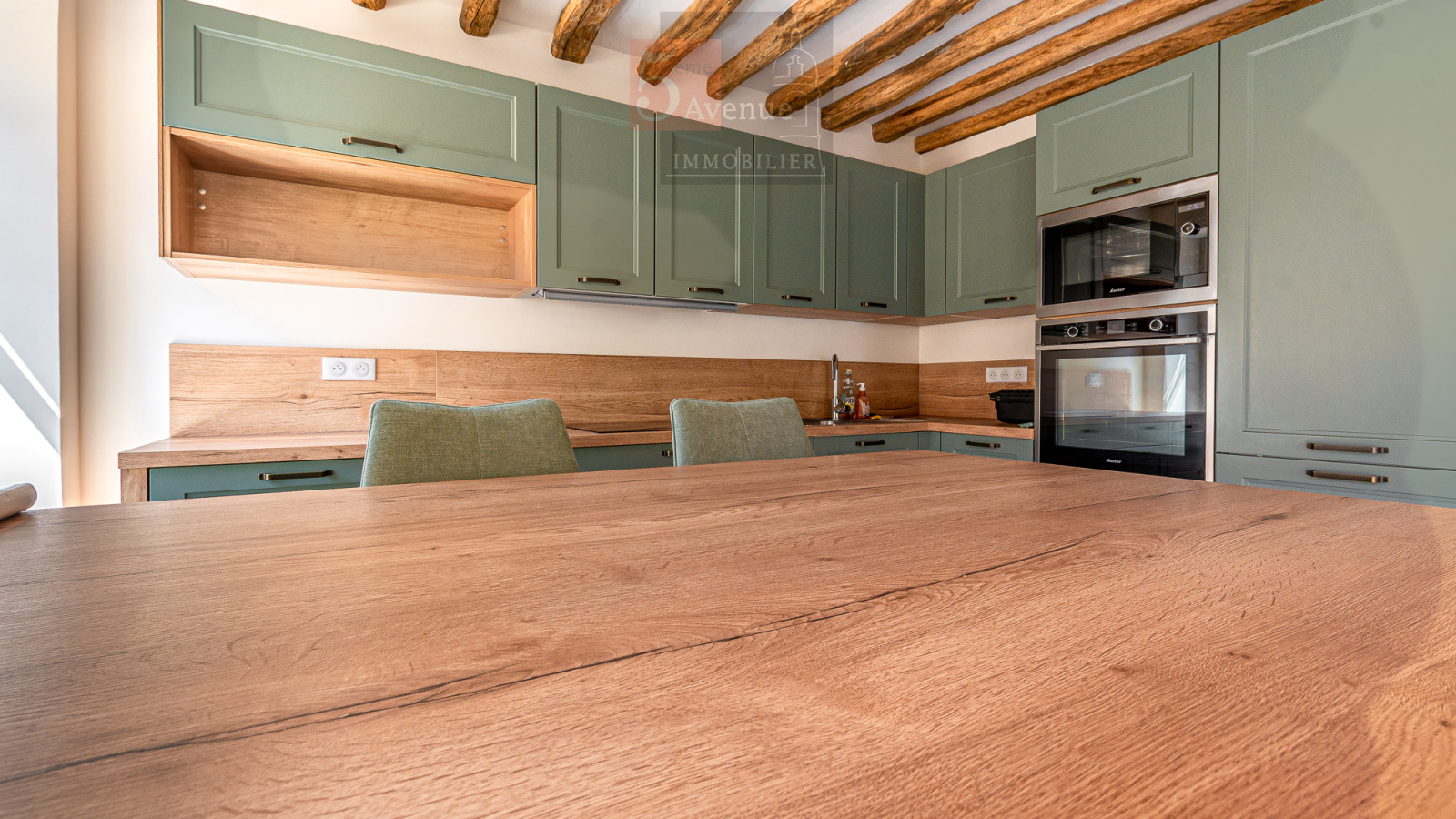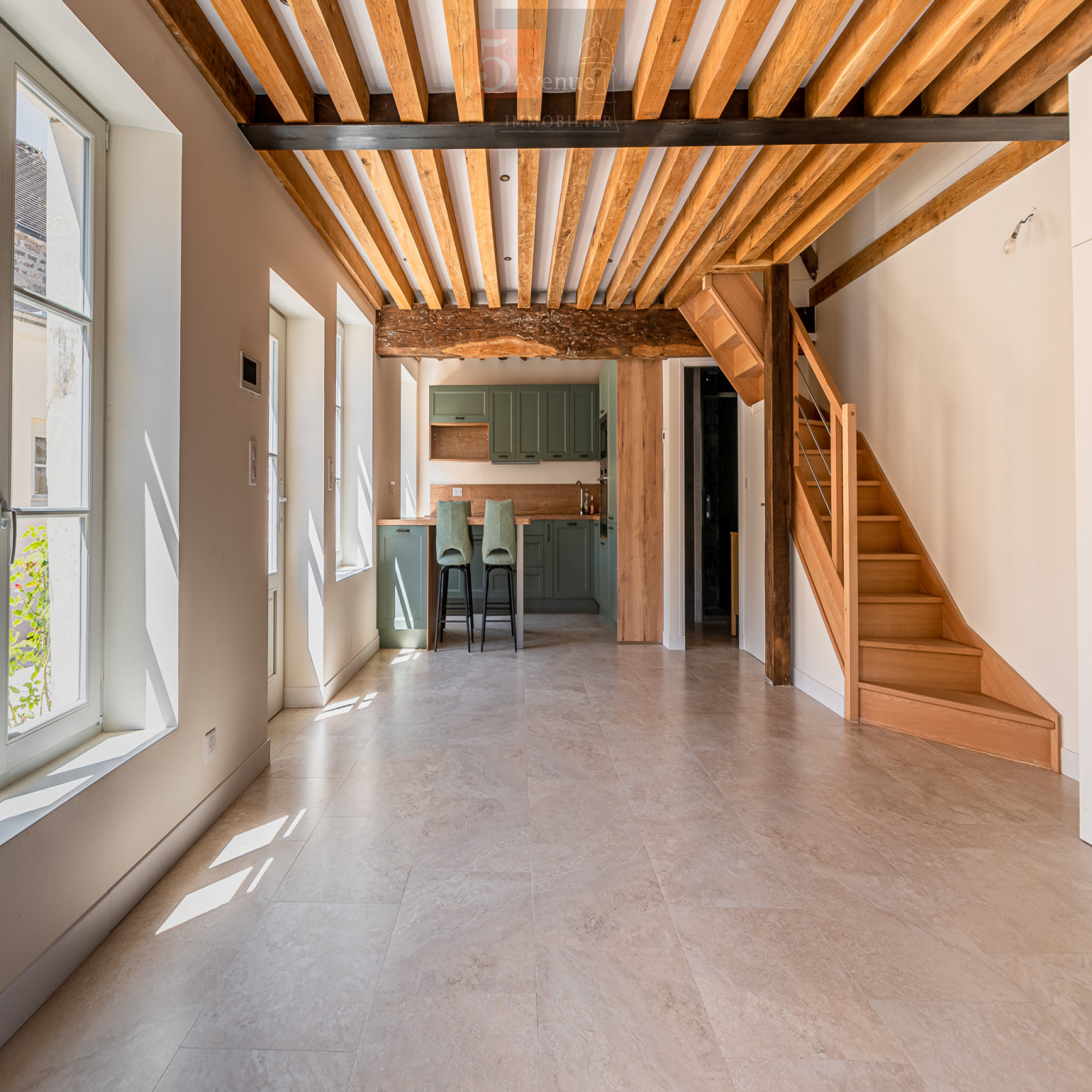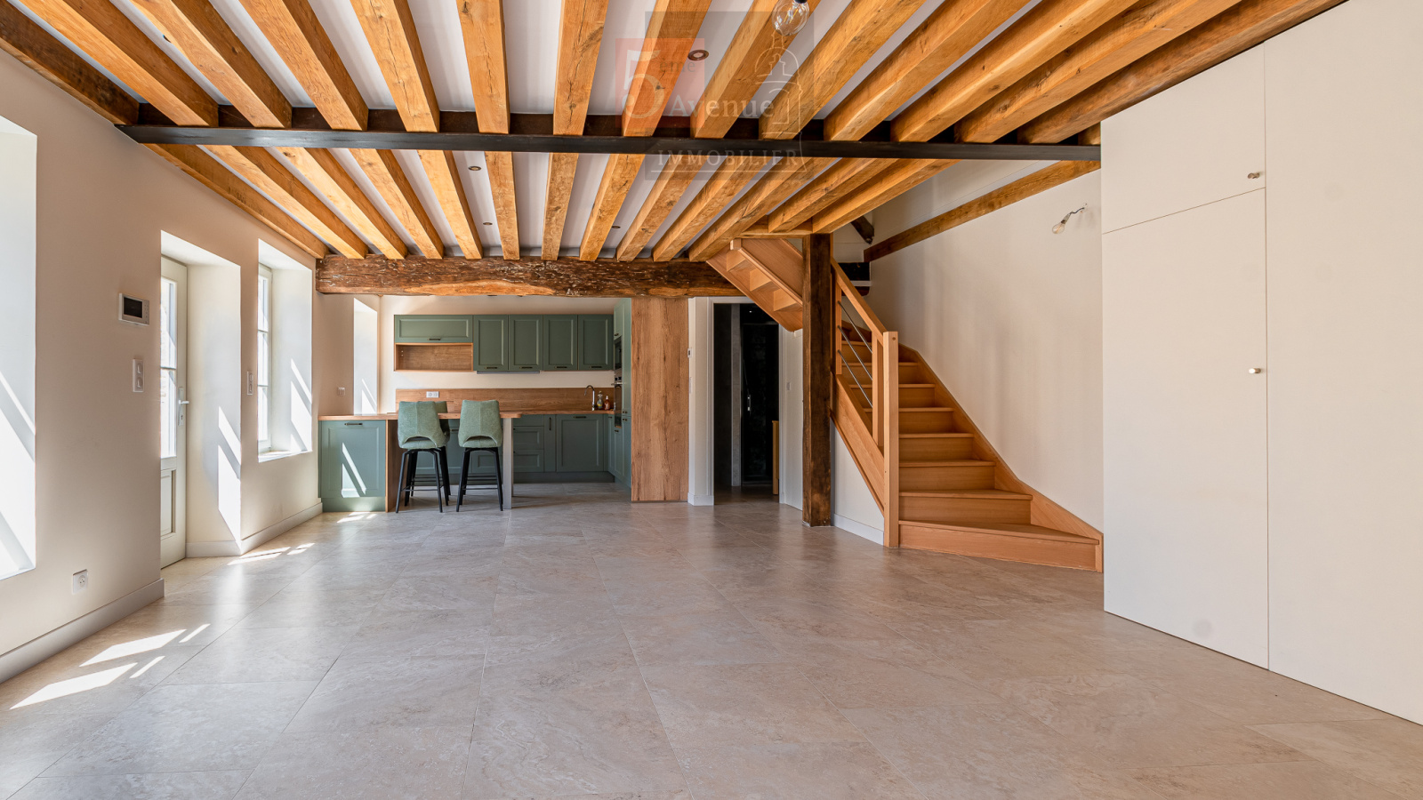Entrée donnant sur un très joli séjour lumineux exposé sud avec poutres en chêne, cuisine ouverte équipée très fonctionnelle avec îlot centrale, salle d’eau
