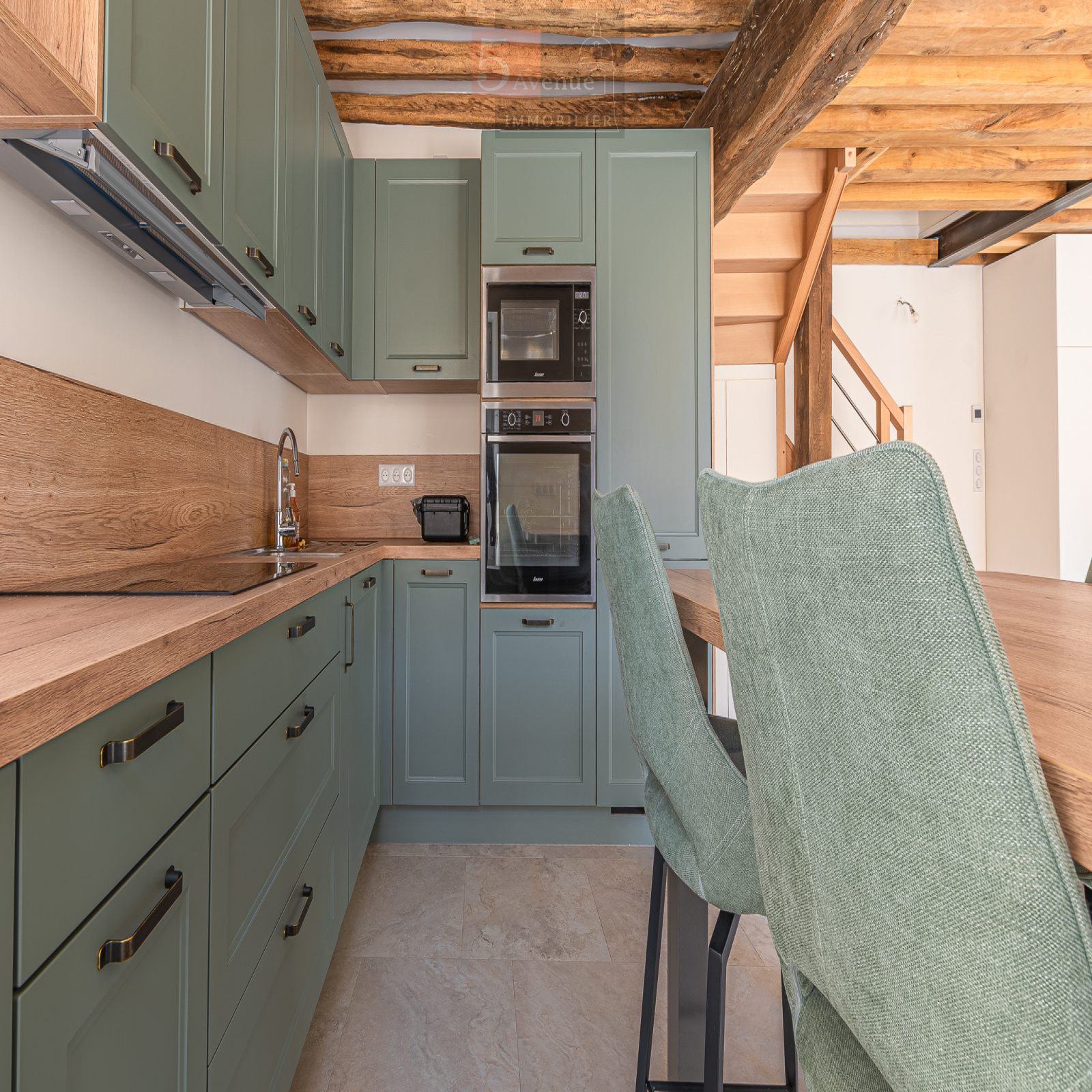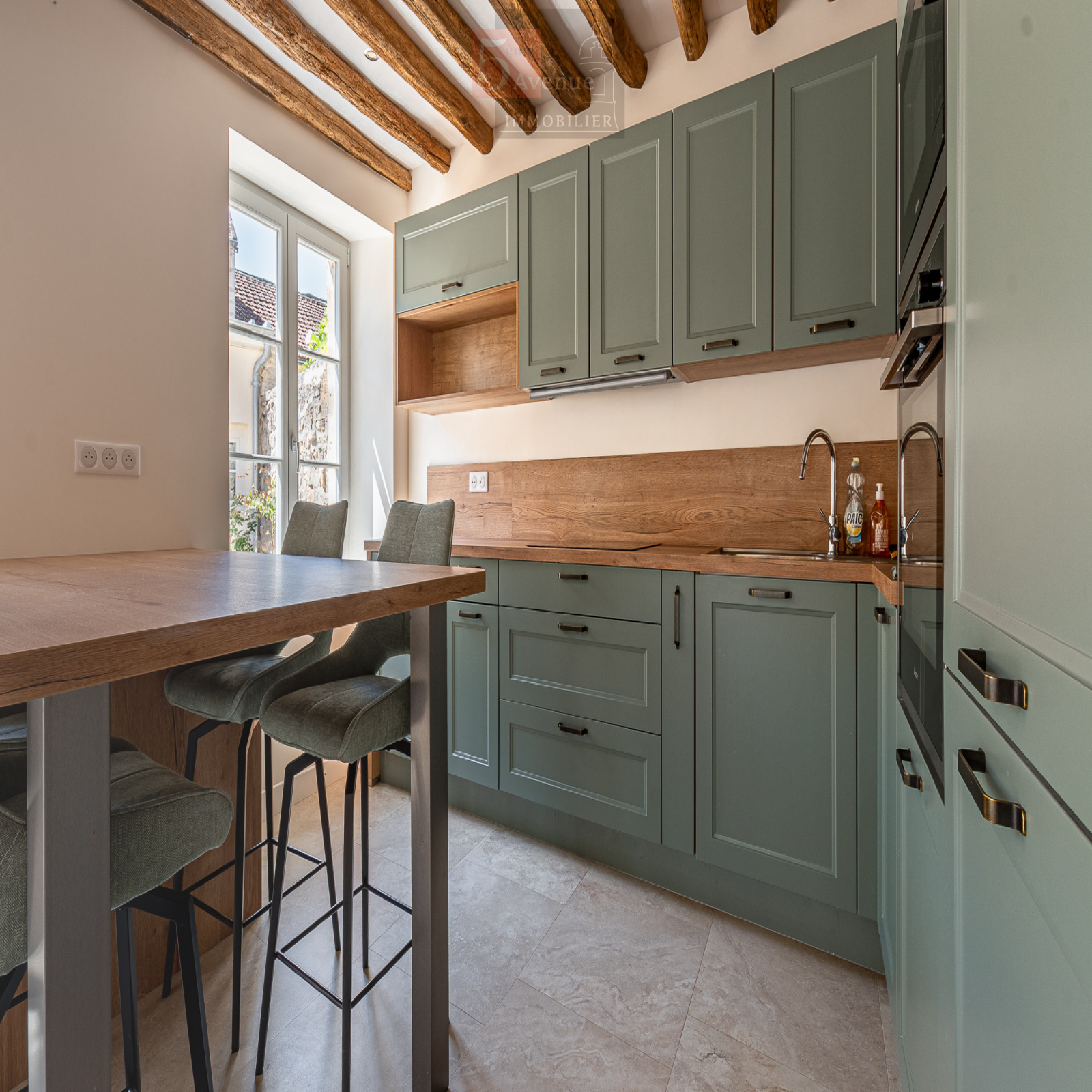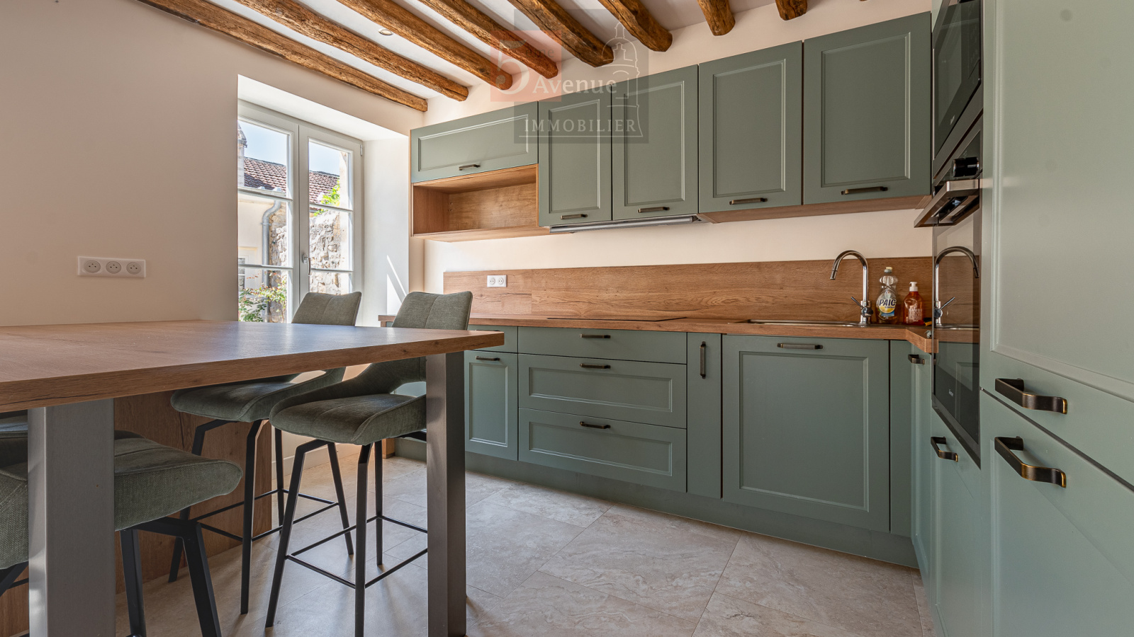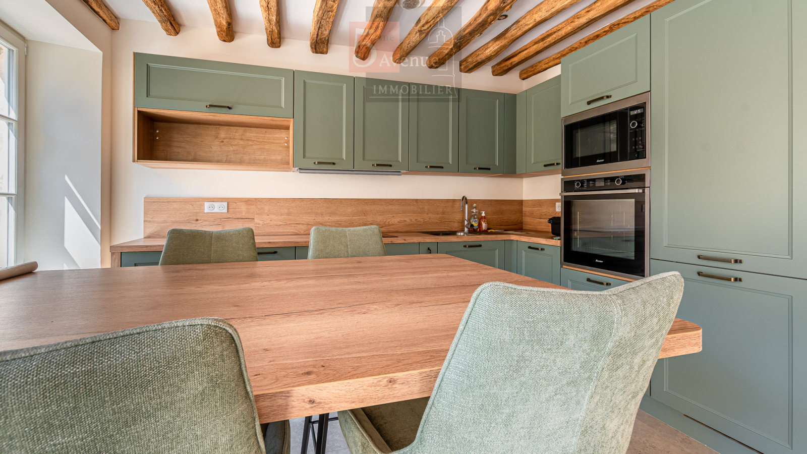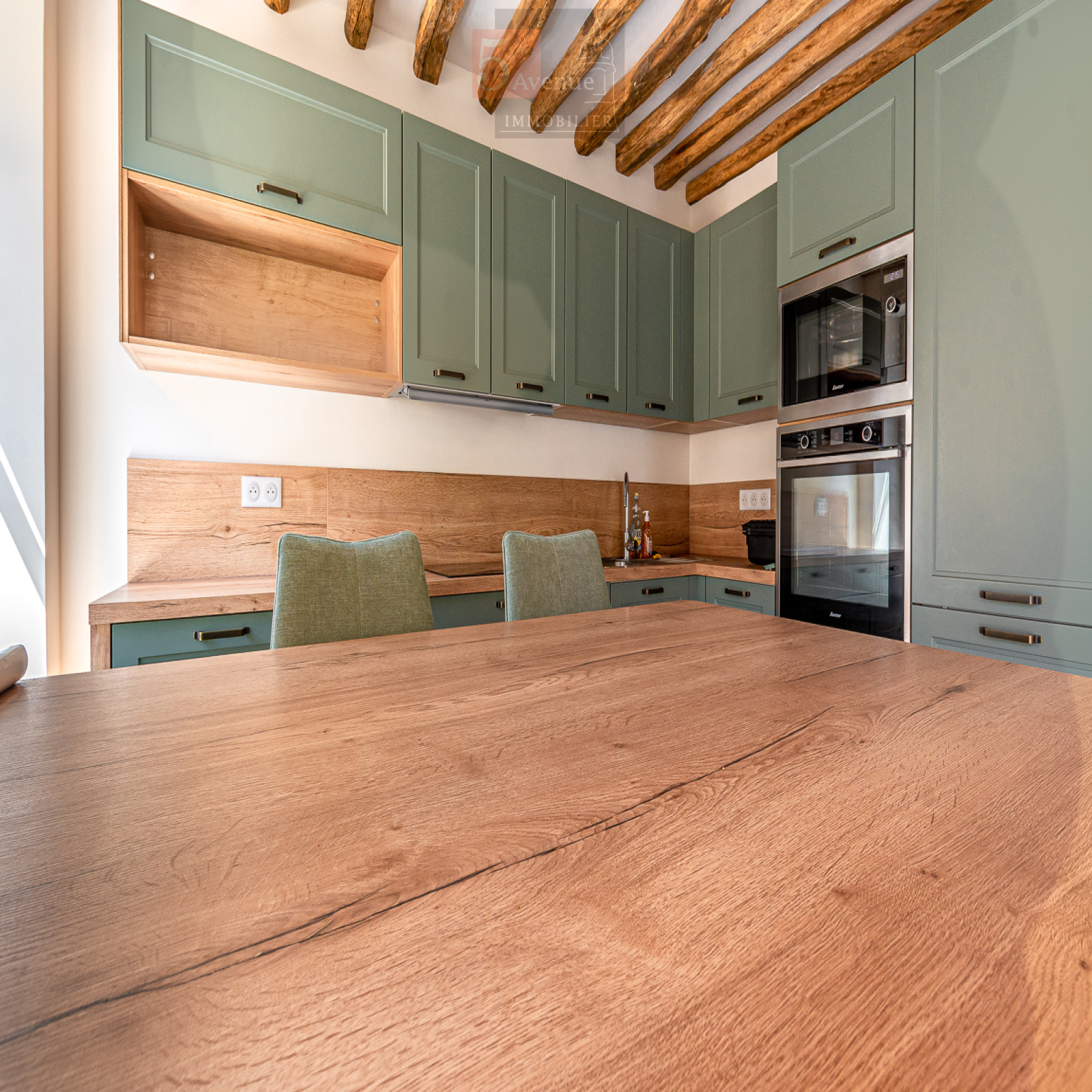 Entrée donnant sur un très joli séjour lumineux exposé sud avec poutres en chêne, cuisine ouverte équipée très fonctionnelle avec îlot centrale, salle d’eau